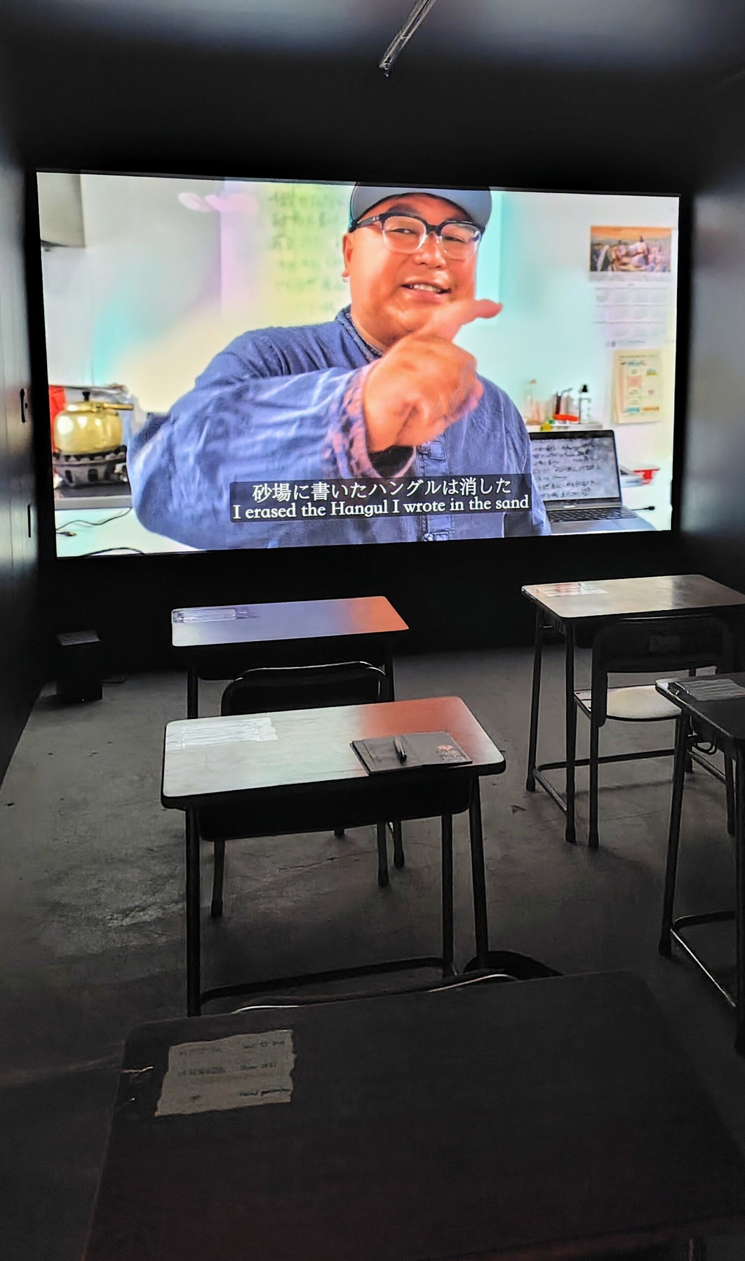スクリーンに写っているハルモニ、その手前で歌っているFUNI、その映像を見ている筆者の3者は、鏡像のような構造だったのです。FUNIを真ん中に挟み、奥にハルモニ、手前に鑑賞者である筆者。しかも、映像内のハルモニたちと同じような机と椅子で筆者は鑑賞しているのです。机には映像に登場するハルモニのプレートが貼ってあるのです。つまり、心理的には、ハルモニと筆者は重なり合う。来場者が映像を鑑賞することで、ハルモニとFUNIと来場者の全員が同時に一体感を味わえるような仕掛けになっており、すっかり感心した次第です。