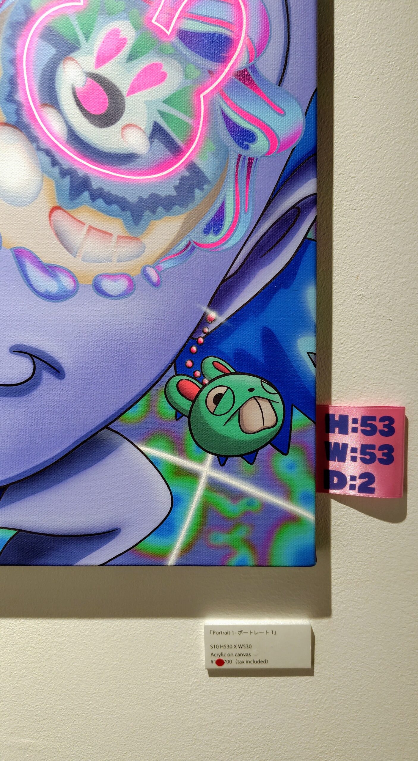 外連味さんの場合、絵画作品の右下に衣服と同じようなタグをつけています。タグの中には、作品のサイズが記載されていました。縦、横、厚さがそれぞれ示されていたというわけです。今回、筆者が拝見した展示では、絵のサイズしかしめされておりませんでしたが、使った絵の具の種類、それぞれの割合、重さ、絵の具代をすべて足し上げた金額(≒原価)、制作にかけた時間などの情報を記載しても面白いと思いました。