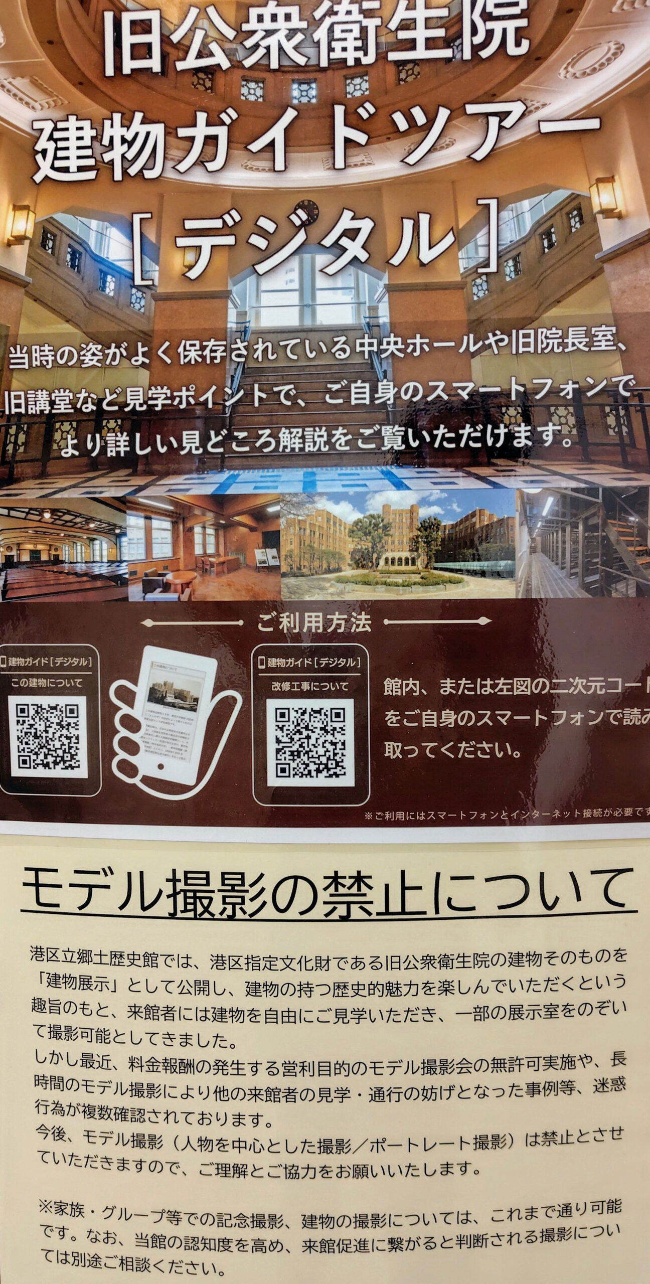 港区立郷土歴史館では、港区指定文化財である旧公衆衛生院の建物そのものを「建物展示」として公開し、建物の持つ歴史的魅力を楽しんでいただくという趣旨のもと、来館者には建物を自由にご見学いただき、一部の展示室をのぞいて撮影可能としてきました。