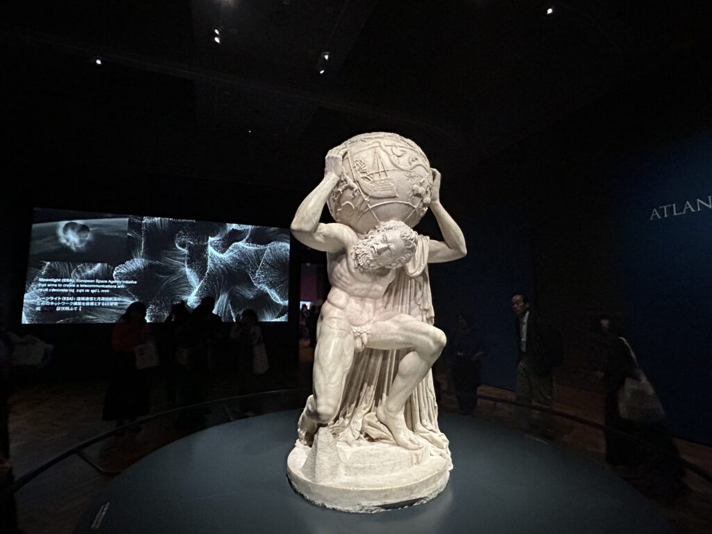 さて、ギリシア神話に登場する「アトラス」は、オリンポスの神々に先行する、巨神族ティターンの一柱で、オリンポスとの戦いに敗れ、最高神ゼウスに西の果てで天空を背負うという役目を負わされたとされる。高さ193センチ、重さ2トンに及ぶ大理石でできた《ファルネーゼのアトラス》は、もともとは古代ギリシアで制作されたものだが、それをもとに150年頃、古代ローマ時代に模刻(ローマンコピー)されたものだ。1546年頃にローマのカラカラ浴場跡で発見され、イタリアの名門貴族ファルネーゼ家に収集され長く所有されていたため《ファルネーゼのアトラス》と名付けられている。発見当時は天球と胴体、顔の一部のみであり、顔や手足は16世紀に補完されたものだ。1786年に現在のナポリ国立考古学博物館に移され、公開されている。複製はないため世界に一つしかない貴重な彫刻で、日本では今回の万博が初公開であった。