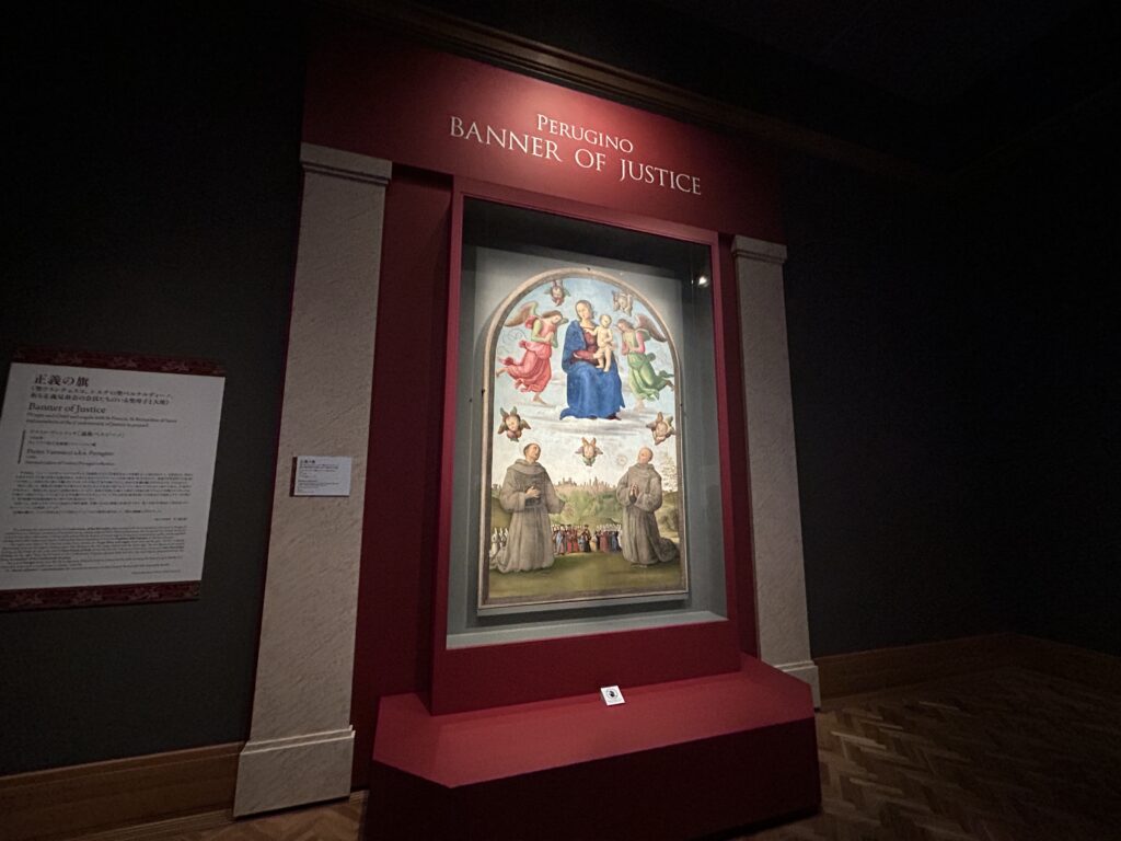 次の「信仰と交流」の部屋では、イタリア館でウンブリア州のイベントに合わせて8月31日から披露されていたピエトロ・ペルジーノの《正義の旗》(1496年)が展示されている。《正義の旗》は、サン・ベルナルディーノ兄弟会の依頼によって制作された。兄弟会とは信仰心を共有する世俗の宗教団体で、中世から近世にかけてヨーロッパ各地で設立され、地域や同業者同士の相互扶助を目的にし、宗教行列の際に旗(ゴンファローネ)を掲げて祈りを捧げたという。後に正義兄弟会となったため《正義の旗》と称されるようになった。上部には顔だけで胴体のない天使、セラフィム(九階級のうち最上の天使)に囲まれた、聖母子と二人の天使、下部には兄弟会の守護聖人であった聖フランチェスコと聖ベルナルディーノ・ダ・シエナ。背景に兄弟会の会員たちとペルージャの街並みが精緻に描かれている。ペルージャのシルエットは今でもほとんど変わらない。
