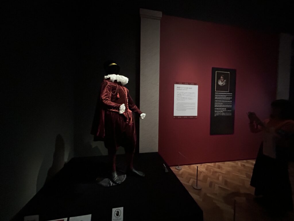 そして同じ部屋に、イタリア館の最初に展示されていた伊東マンショ像の複製画が展示される予定だ。現在は現物はすでにイタリアに輸送されており、複製画の最終の色合わせをしているところだという。伊東マンショ像の複製画が展示されるスペースの前に、伊東が着用している衣装が、当時の縫製技術と生地で再現され展示されている。ベルベットを主とした光沢感のある海老茶色の生地の上下に、6000針以上の手間がかかっているという特徴的な白い襞襟(ひだえり)がついている。イタリア館では、応接室に飾られていたとのことなのだが、こういうものもあるなら展示した方がいいということで急遽展示されるようになったという。