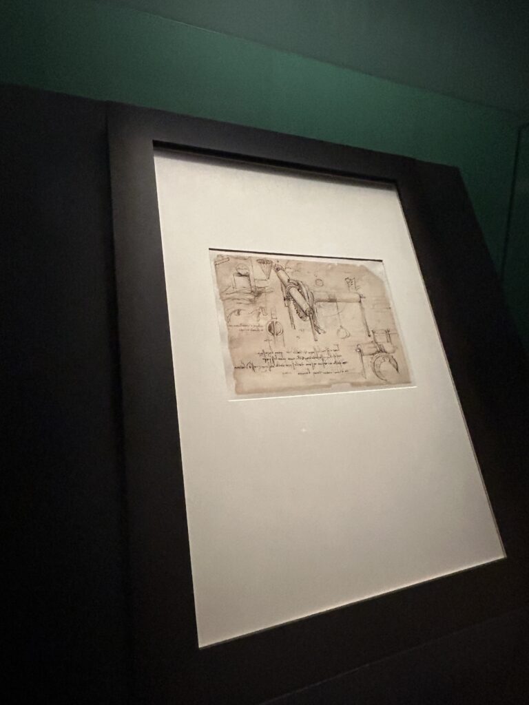 イタリア館では膨大な観客が滞留しないように、立ち止まることはできず、じっくり見ることは叶わなかったが、今回は限度はあるもののある程度観察することはできるだろう。鏡文字で書かれた文字は、紙の裏から透けた文字を見ると普通に読むことができる。紙の裏に書かれた文字がうっすら透けて見えるのも興味深い。そして、ダ・ヴィンチの手稿は、現在の特許の明細書とも遜色ない、3次元のわかりやすい図で描かれており、今日生きていたとしても相当な発明家になったことは容易に想像できる。