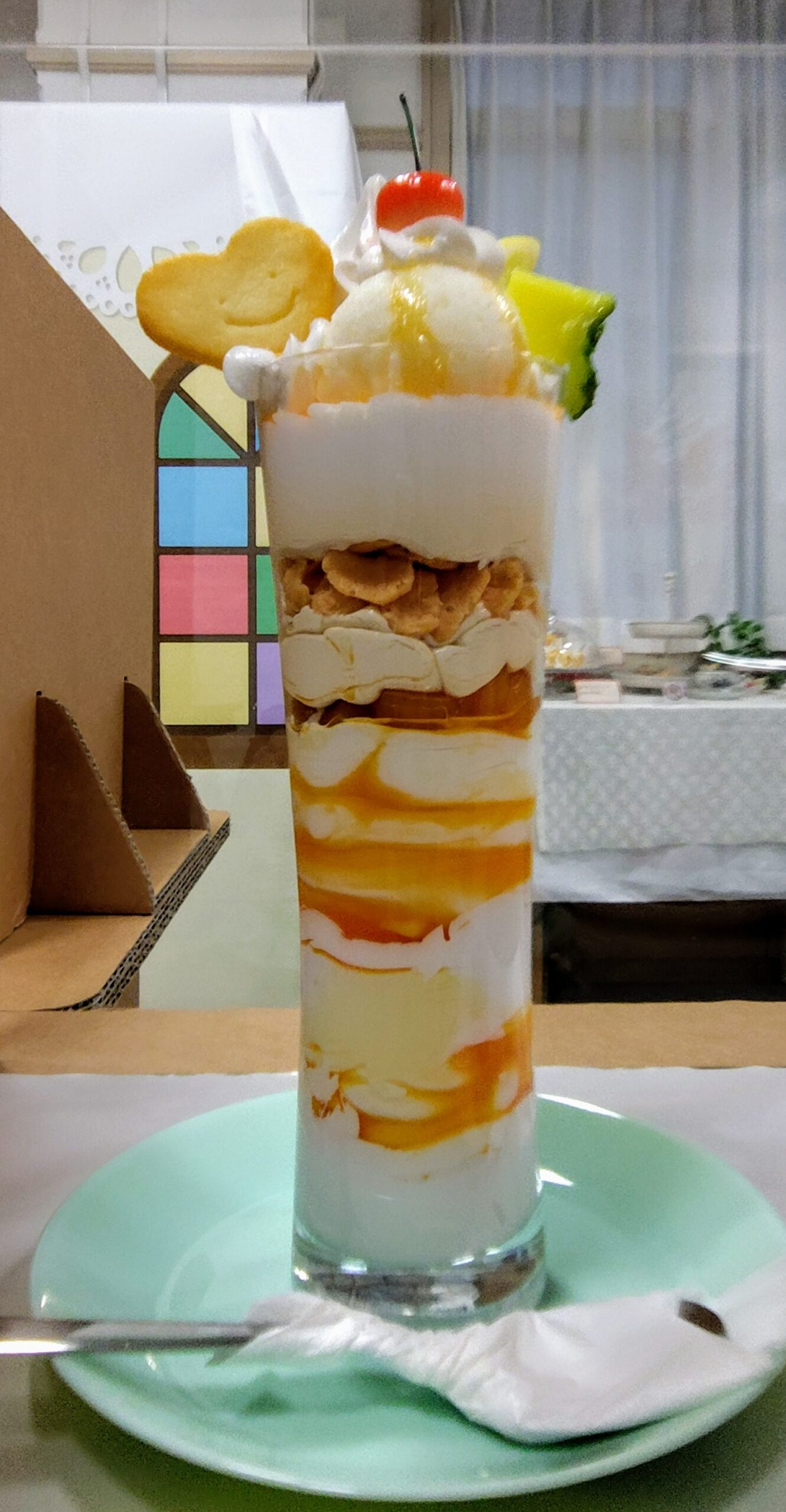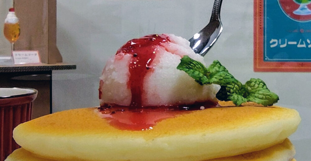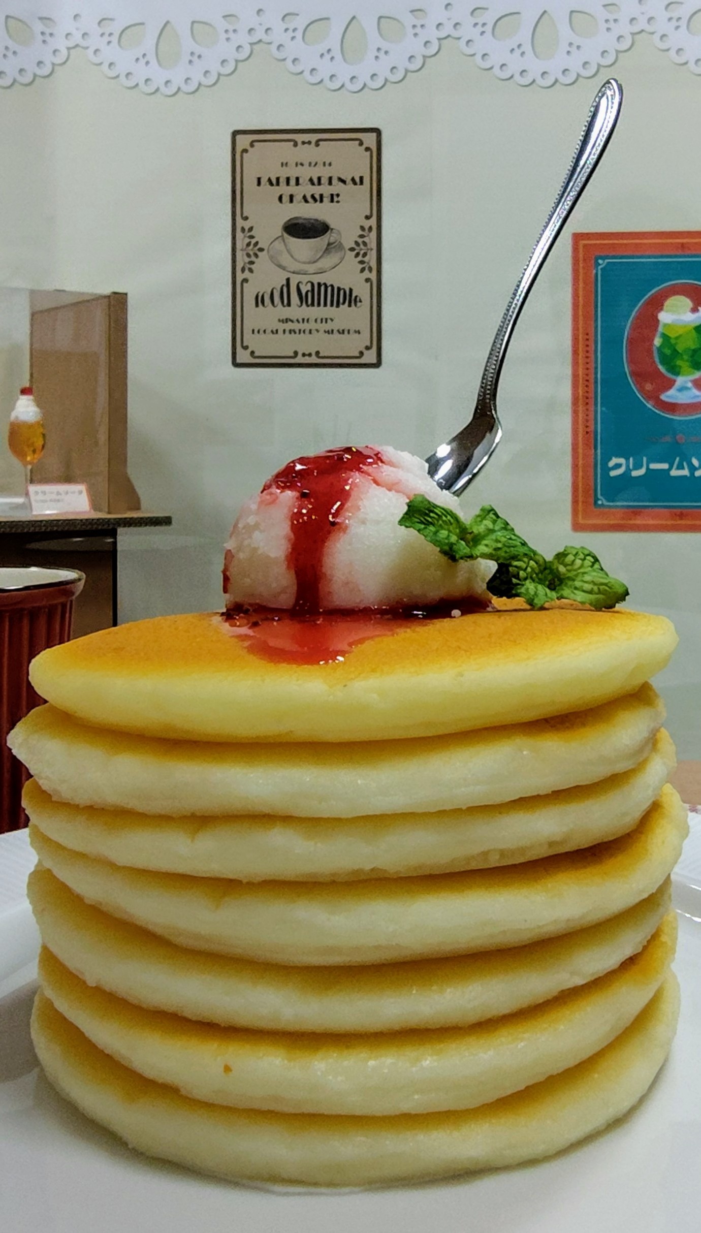 パンケーキは大和サンプル製作所の作品です。ケーキが7段も並び、てっぺんにはアイスクリームがどかんと鎮座しています。ストロベリーソースの赤とミントの緑の葉っぱが目を楽しませてくれます。アイスに突き刺さったスプーンは、視覚的な遊びとしての仕掛けでしょうね。喫茶店やパーラーでスプーンを突き刺したら、親から「お行儀が悪いから、そんなことするのやめなさい」と叱られるのは間違いありません。あくまでも、遊び心でスプーンを突き刺していると、読者の皆様もご理解よろしくお願い申し上げます。