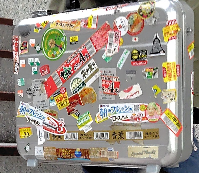 スーパーで売っているハムやプリンやお茶などの容器・包装についているシールを丁寧に剥がした上で、それを再利用してアタッシェケースにべたべた貼っているのです。筆者も長年、ステッカー観察をしていますが、食品のシールをステッカー代わりに貼付するという作例は初めて発見しました。