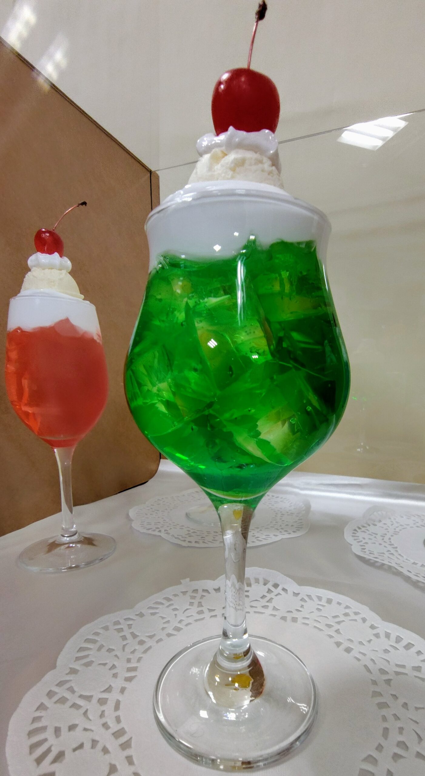 大和サンプル製作所、Nomple(世古紀子)の手になる全23点の作品が一堂に集まっているわけですが、あまりのリアルさに驚かされました。どう見ても、これは本物です。とてもおいしそうです。クリームソーダ(Nomple作)は、あの激甘、かつ色鮮やかで強い炭酸を感じさせる液体が見事に表現されております。小さな頃、親と一緒にデパートにお出かけをして、ちょっとお高めの「●●パーラー」のようなお店で休憩したときに、よく飲みましたね。大人になってからは、ストレートの紅茶やコーヒーばかりを飲むようになってしまいましたが、今、クリームソーダを飲んだら、どんな感想を持つのでしょうか?