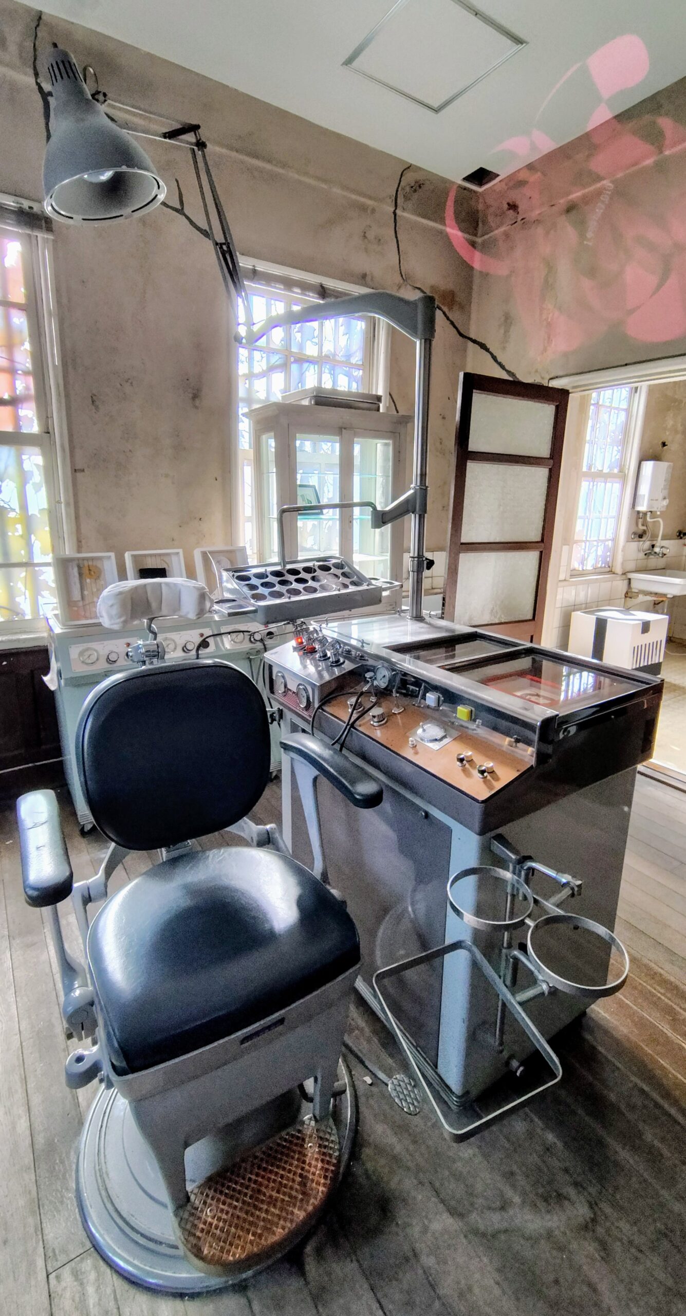 診療時に座る椅子とその周りの医療器具にも驚きました。えっ、これって筆者が幼いころ、病院に行った時の什器とまったく同じではないですか。昔の医療器具は、今よりも見た目が怖くて、どこか厳かで物々しい雰囲気が漂っていました。現在は、ずいぶんソフトでマイルドで、患者さんフレンドリーな什器に変わりましたよね。