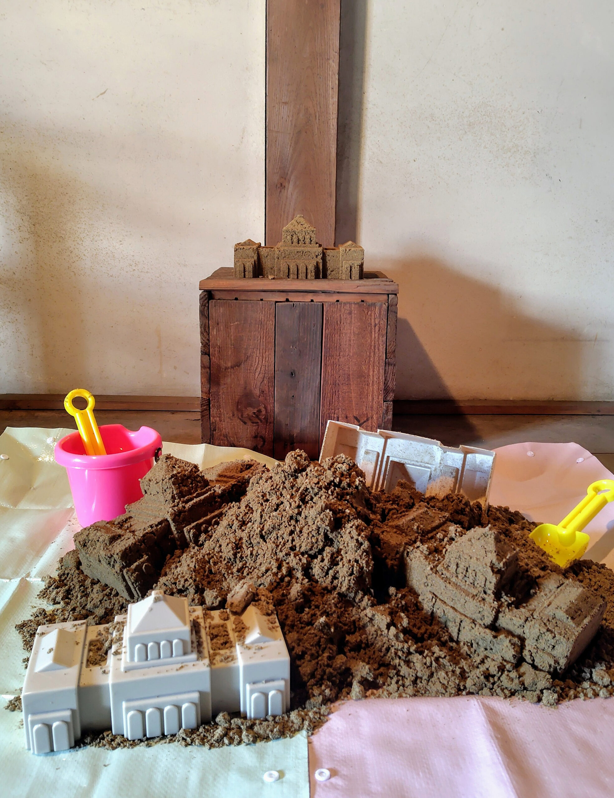 そんな、あれやこれやを考えながら次に向かったのは、S邸です。築100年を超す、靴下を織る機場や蔵や二階建ての母屋があります。本園師芳の「砂の城」(2025年制作)が風刺に富んでいました。砂場などで砂を入れて型を取るおもちゃが無造作に床面に置かれていますが、よく見ると、国会議事堂なんです。もろく崩れてしまう国会議事堂の姿は、まさに現代の日本社会そのままのようで、しばらく見つめてしまいました。