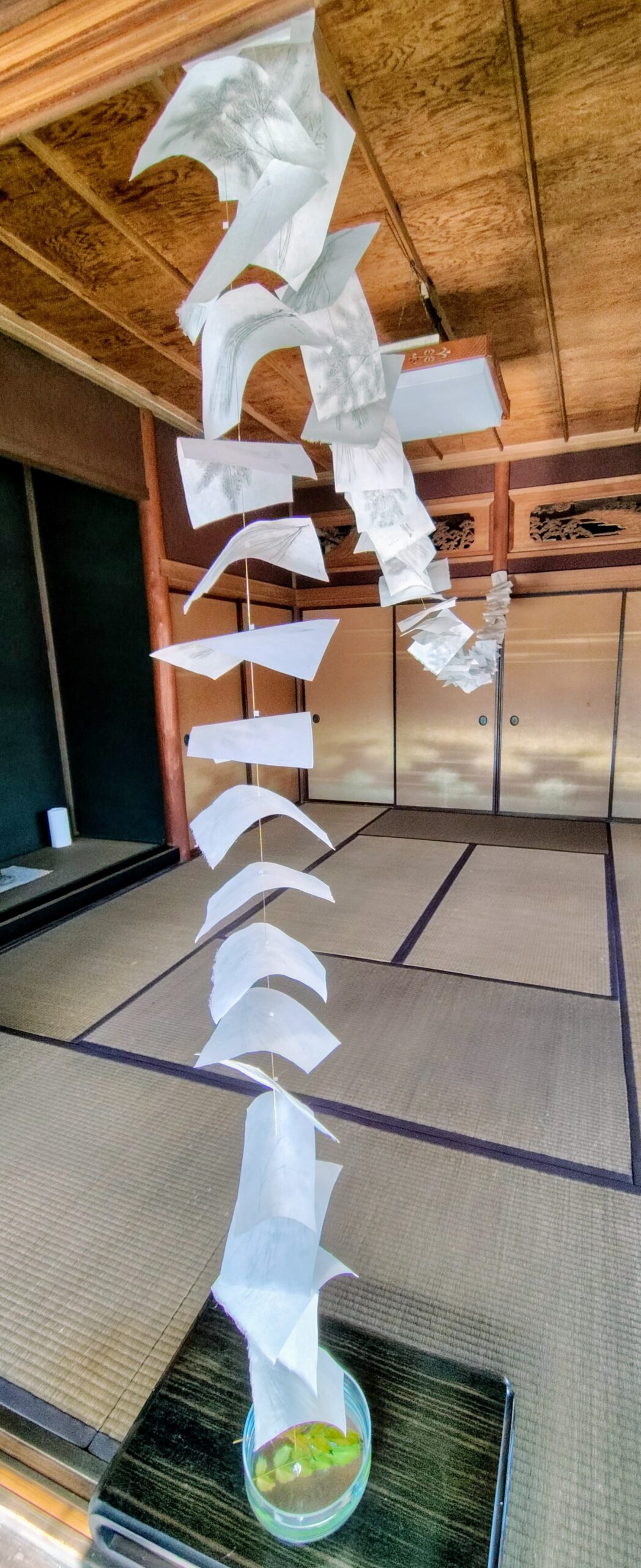 伊勢町K邸は、建物そのものが芸術作品のようでした。1940年、小林機械製作所社長・小林忠蔵氏の自邸として建造された立派なお屋敷です。長野県渋温泉にある「歴史の宿 金具屋」の外観を模しており、建物内部の装飾にも非常にお金をかけたことが一目瞭然です。栃木美保は「水と風の道」と題する作品でK邸の庭に生える植物を利用しました。松、もみじ、ひいらぎ南天という3種の植物の葉の拓本を用いて「命育む土は 水と風の通る道」であることを表現しています。