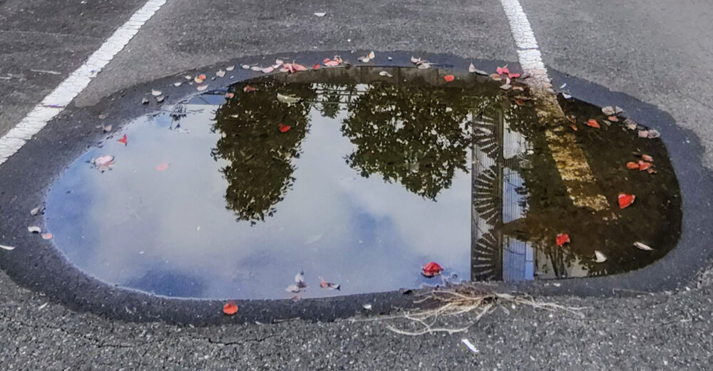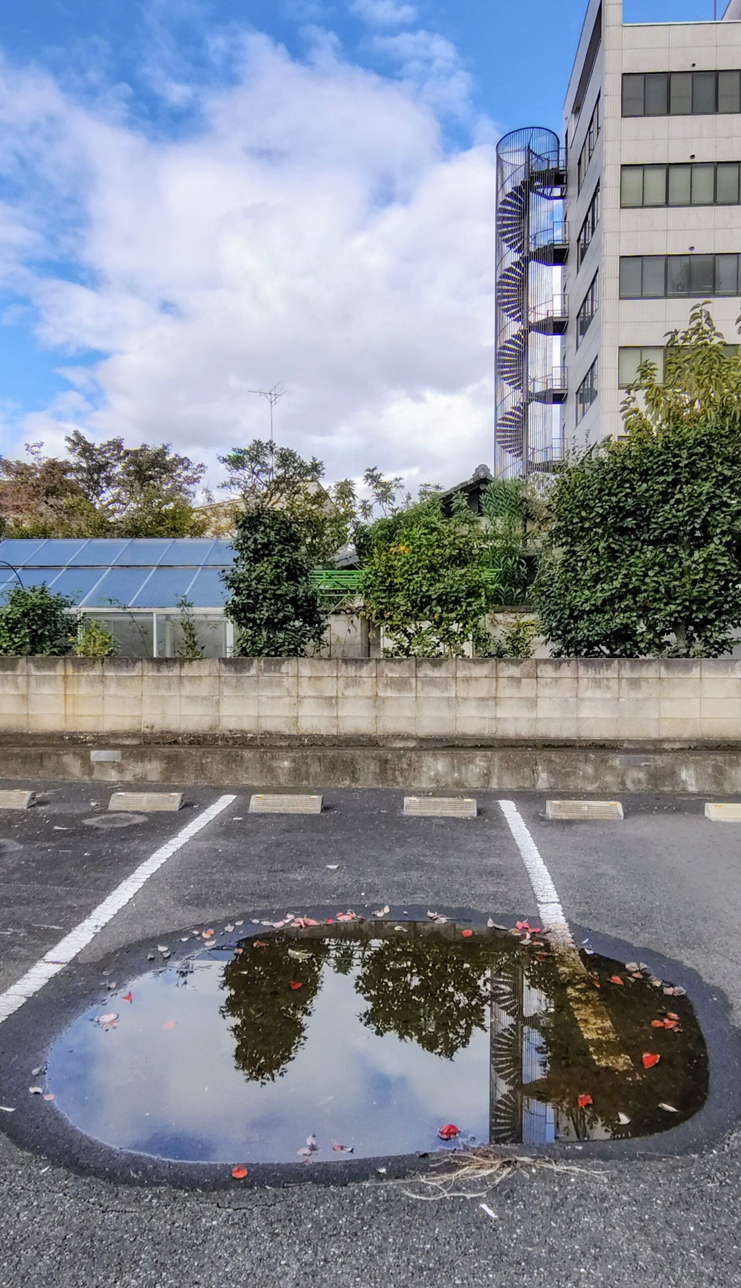 さぁ、さらに足利市立美術館へと向かっていると、今度は駐車場の水たまりと出合いました。上方の建築物の一部が水面に映り込んでいるのがお分かりでしょうか?