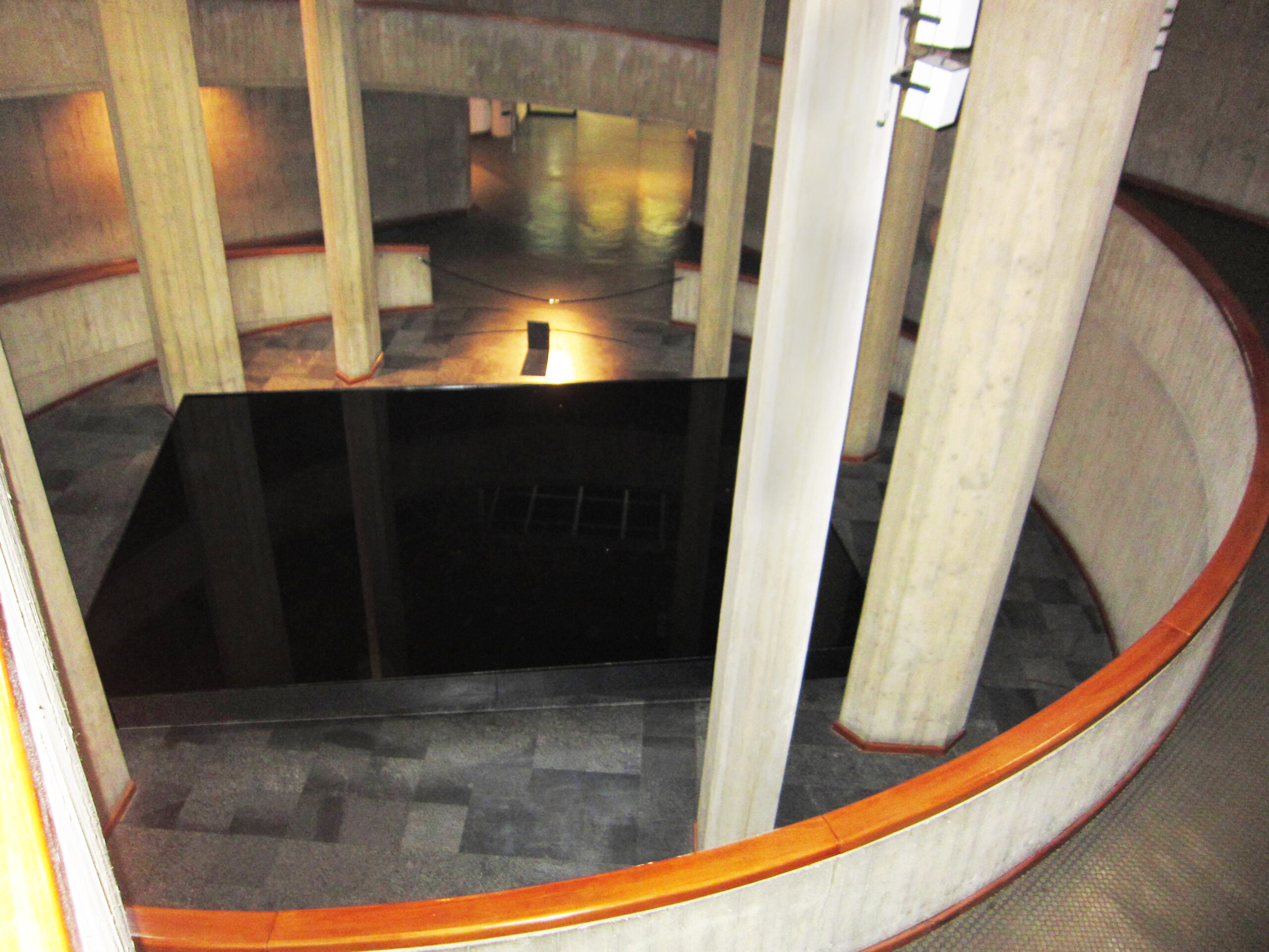 ここで注目すべきは、この作品では台座により鉄製容器全体が少し床から平行に宙に浮くことで、一面に張られた油の表面がその分だけ現実感を薄め記号化することである。それにより、廃油の背後に広がる目に見えない工業化社会という社会的現実も暗示されやすくなる。言わば、《Matter and Mind》の黒い表面は、現実の工業化社会の「写し鏡」なのである。
