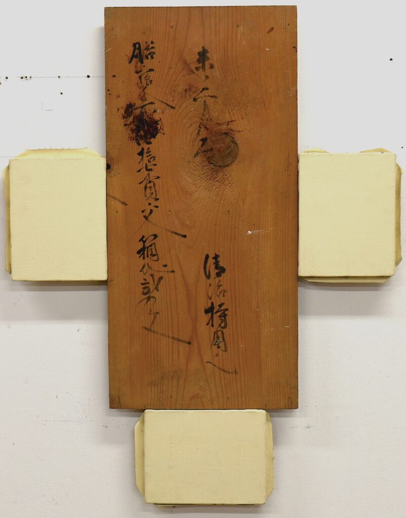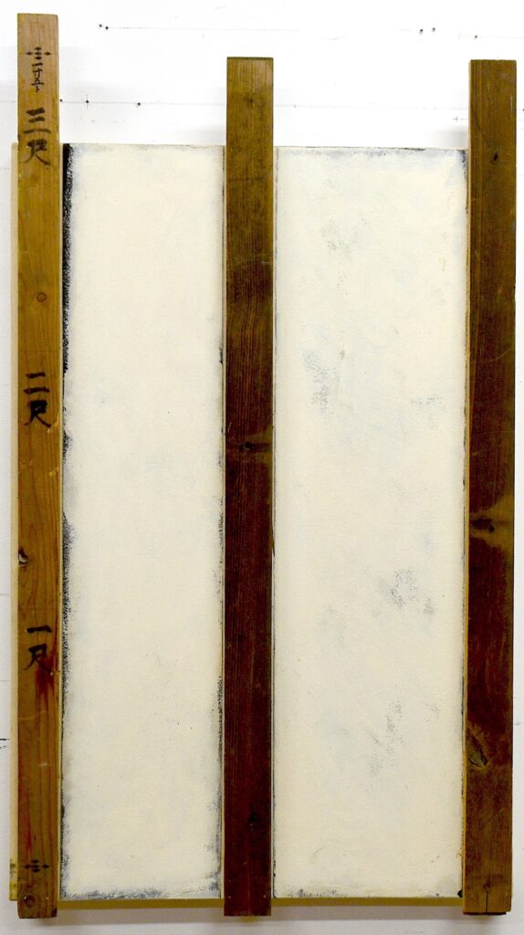 さらに、そうした原口芸術の本質を顕著に示すのが、これらと同時期に制作された《Untitled か》(2016年)(図5)と《⽩の構成 3》(2016年)(図6)である。この二つは、廃屋で収拾した木材に白いキャンバスを結合した作品である。いずれの木材も古色を帯びており、素材の物質性と触覚的実在性を生々しく感じさせる。また、どちらの木材にも建築時に書き込まれた文字が残されており、実際に特定の建築部材として使用されていたことが実感される。
