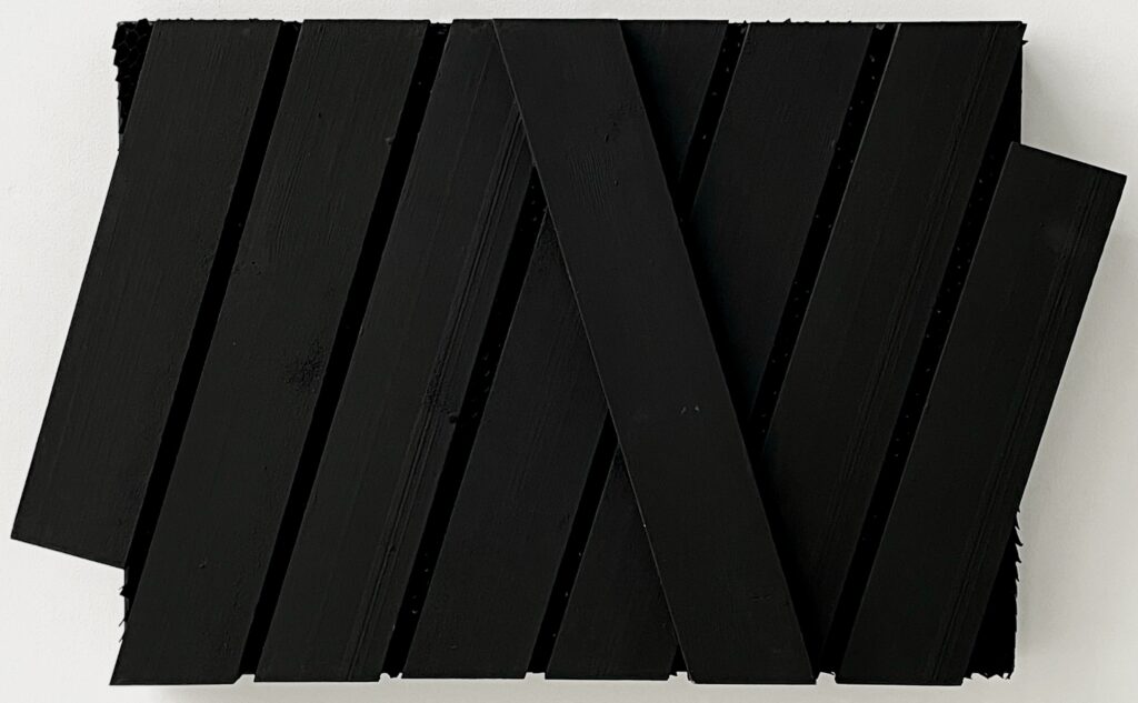 実際に、最晩年に制作されたレリーフ状の《Black B》(2020年)(図7)や《Black C》(2020年)(図8)では、厚みを持って組み合わされた合板と鉄とポリウレタンがややムラのある塗装をされることで素材の物質性と触覚的実在性を顕わに示している。その上で、黒一色で記号化された表面は、私達の周囲の工業化された都市空間を想起させずにはおかない。