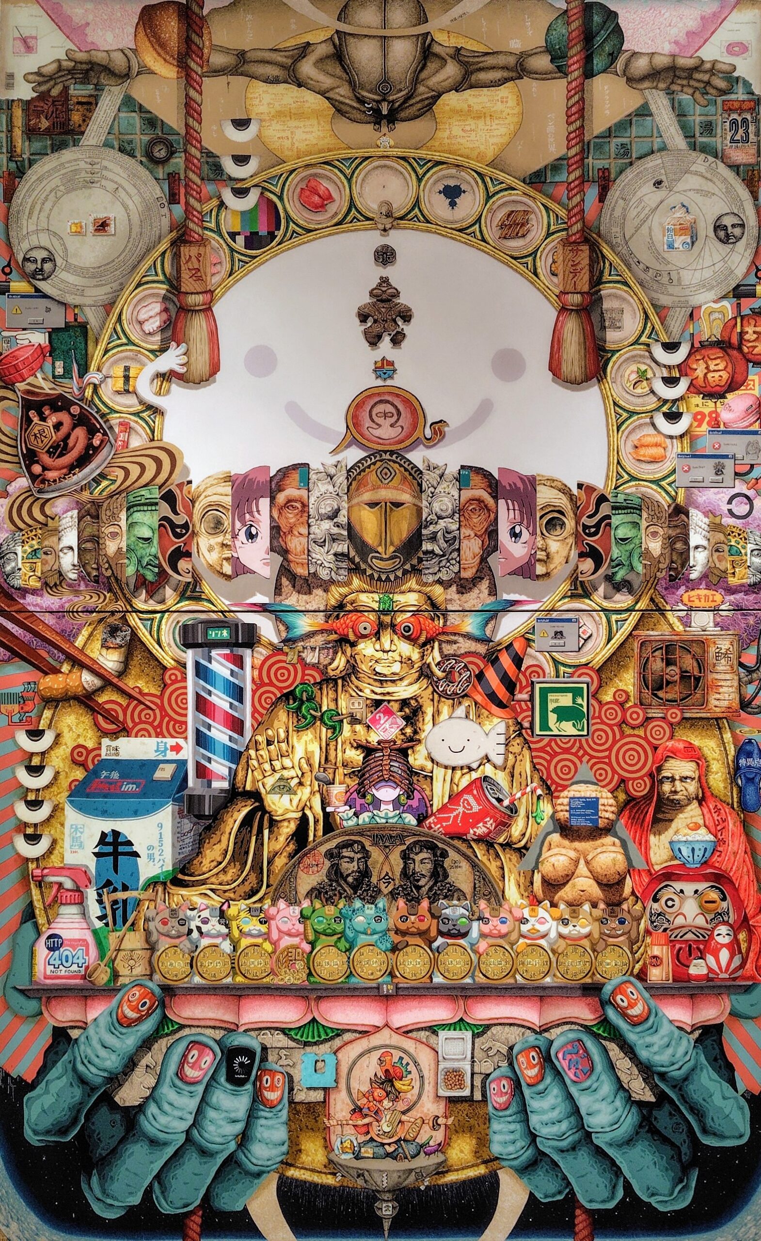 作風は単純明快です。自分の好きなモノ・コトをとにかく画面をすべて埋め尽くすようにミッチリ描くだけです。専門的に美術を学んだことはなく、完全に独学を貫き通してきた飯山さんの作品には、有無を言わさぬほどのパワーがあります。