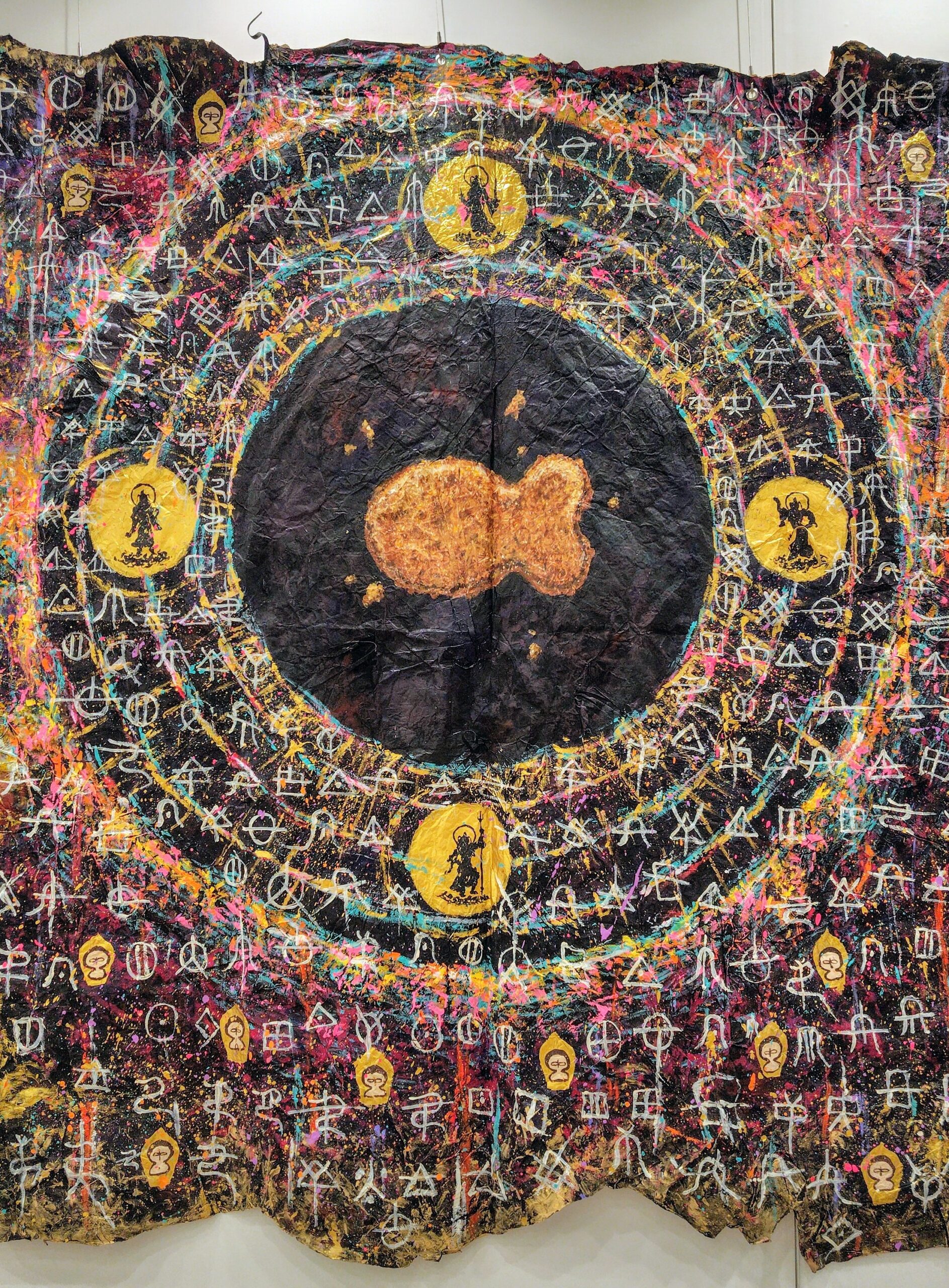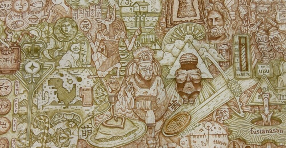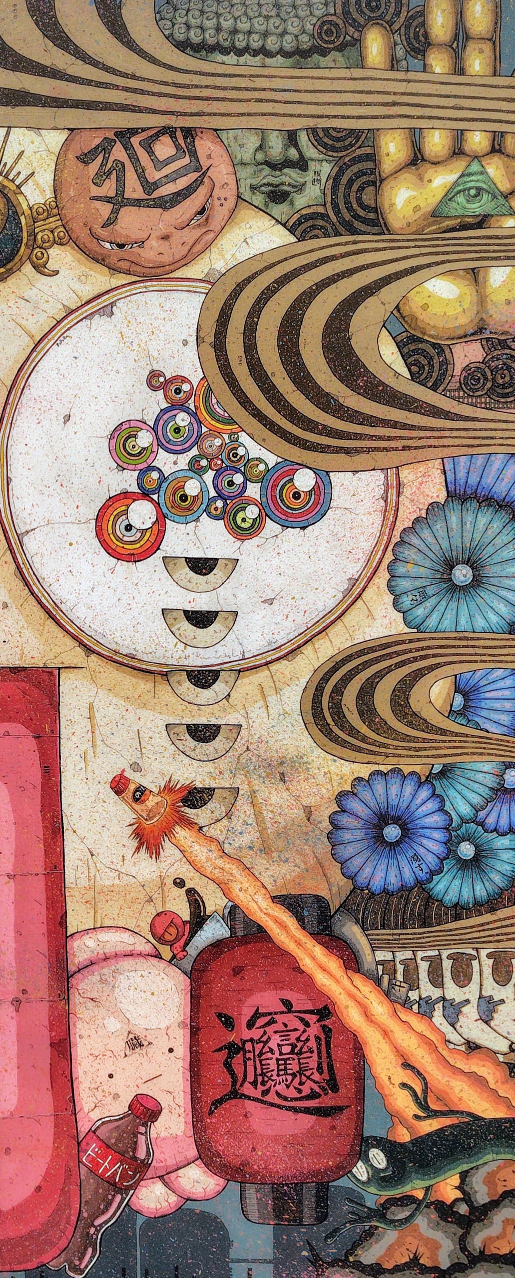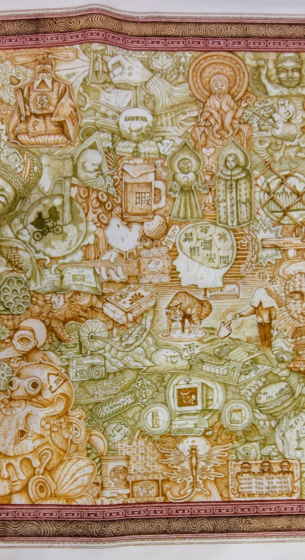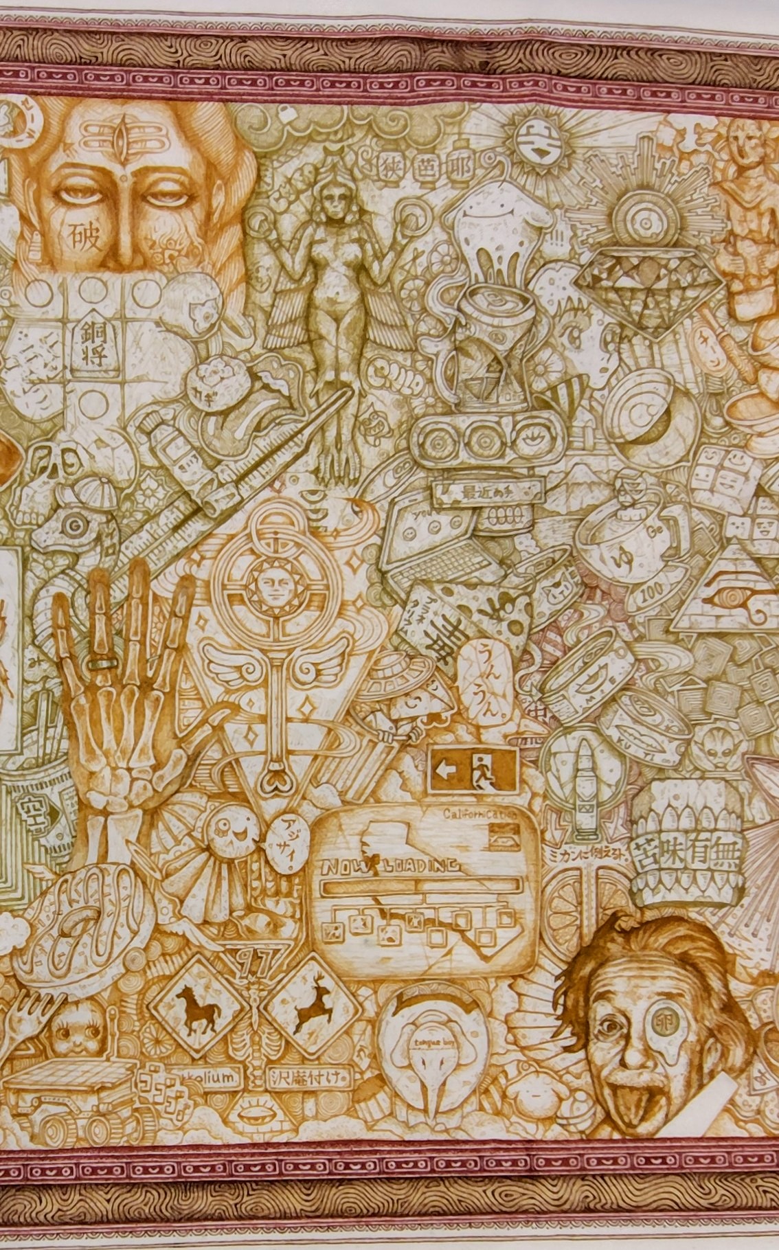 この集中力を反映したかのように、飯山作品のビッシリ感も半端ないです。本当に、ビッシリ、ギッシリ、ミッチリ、ギッチリ、絵やら文字やらみょうちきりんな漢字やらが「これでもか、これでもか」と詰まっています。