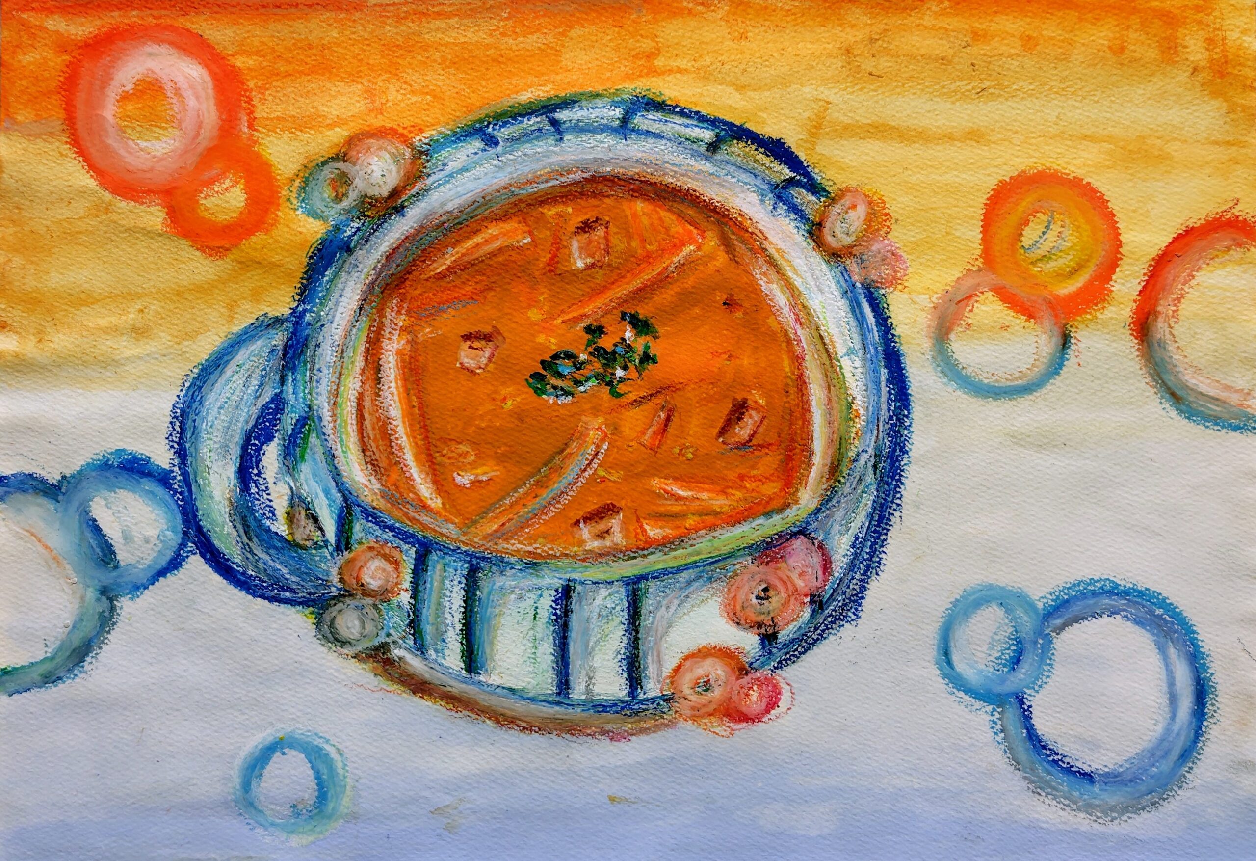 何と素晴らしい自作解説なんでしょうか。スープの表面の輝きから夕陽を想起してほしいーー確かにそうです、その通りです。夕日を浴びながら、さんざめいている海の水面のように、カップの中にも小さな海と太陽が確かにきらめいていたわけです。この子の作品と言葉に出合ったおかげで、筆者はこれから先、おいしいスープを飲む時は、夕陽を思い出すことでしょう。