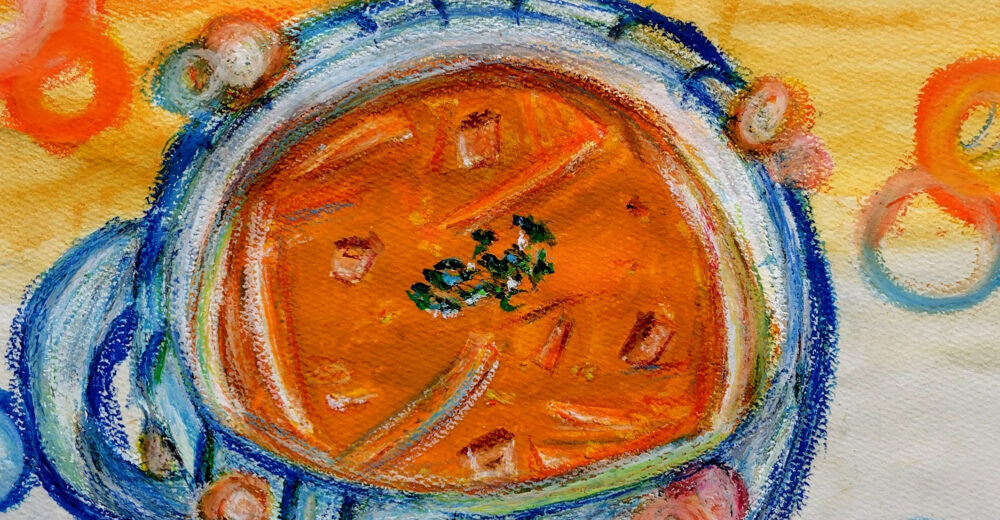 それにしても素敵な絵ですね。カップに入ったスープが夕陽そのものに変容し、空中に浮かんでいるみたいです。太陽の光は世界中、分け隔てなく届いています。そのように、温かくておいしい一杯のスープが飢えている方、戦乱で苦しんでいる方にも届いてほしいな、と心より思いました。
