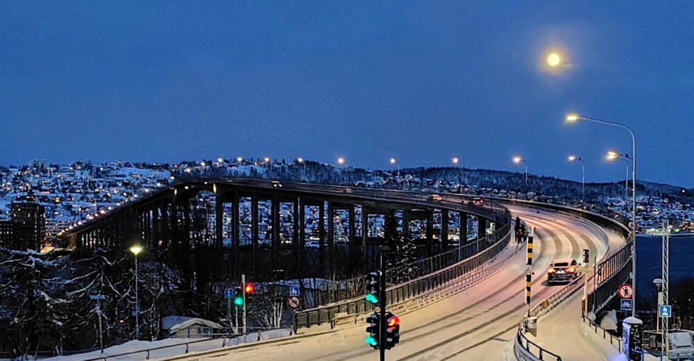 夜のように見えるが、午前10時前のトロムソ。長さ約1キロのトロムソ橋が伸びる