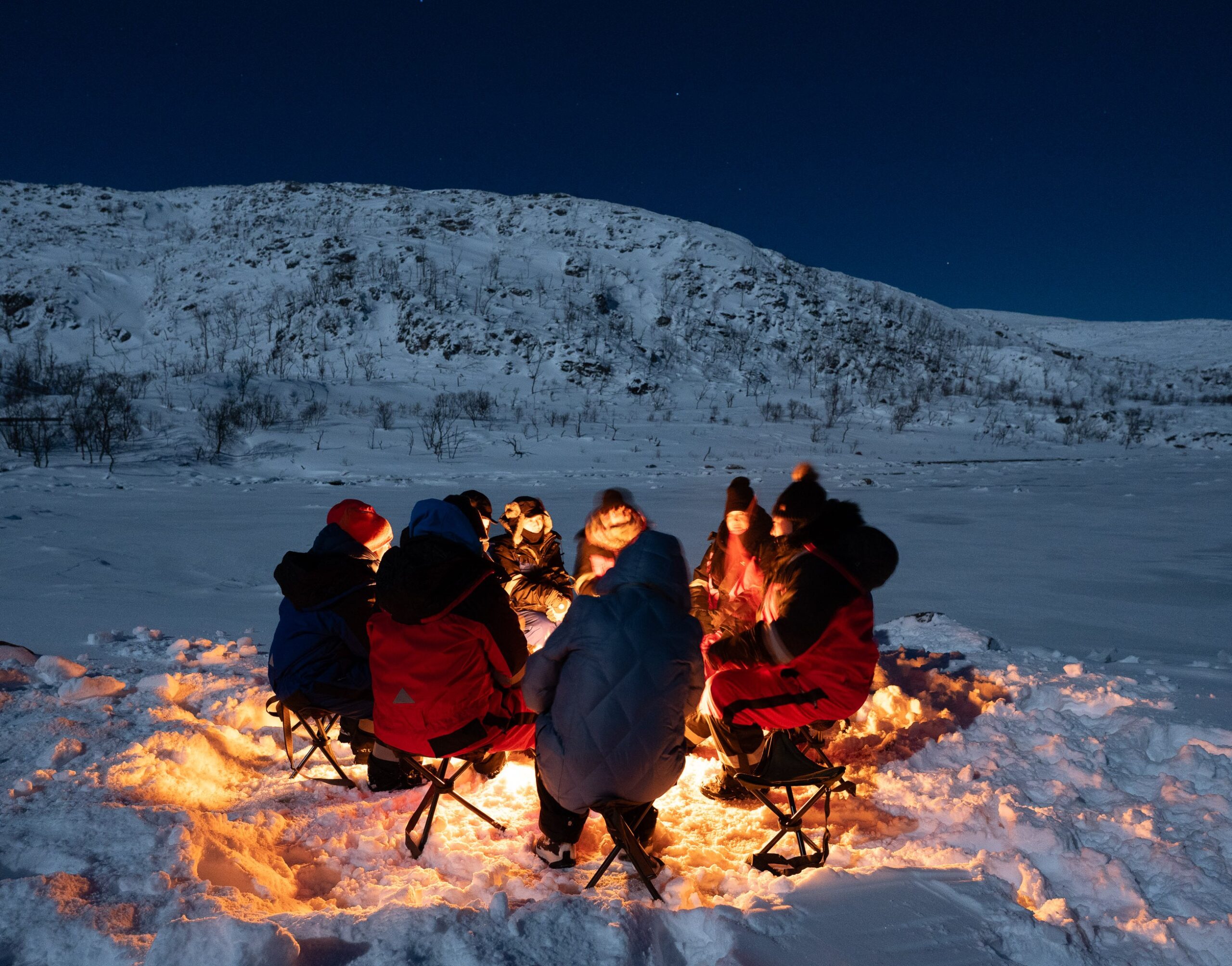 ツアーの催行会社は、「これですぐにトロムソ中心部に帰ったら、お客様に申し訳ない」と思っているようで、ここから、延々と3時間弱ほどのオーロラ待機タイムが始まりました。薪をくべながら、参加者全員が車座になります。ガイドさんが進行役を務めながら、ここから先はオーロラが再び出現するまで英語を使いながら、皆でトークをするのです。まずは簡単な自己紹介をして、ガイドさんがそれぞれの参加者に適宜、質問を投げかける。するとその答えに対して、他の参加者が質問をしたり、相槌を打ったり。そうやって、ひたすらオーロラを待つのです。