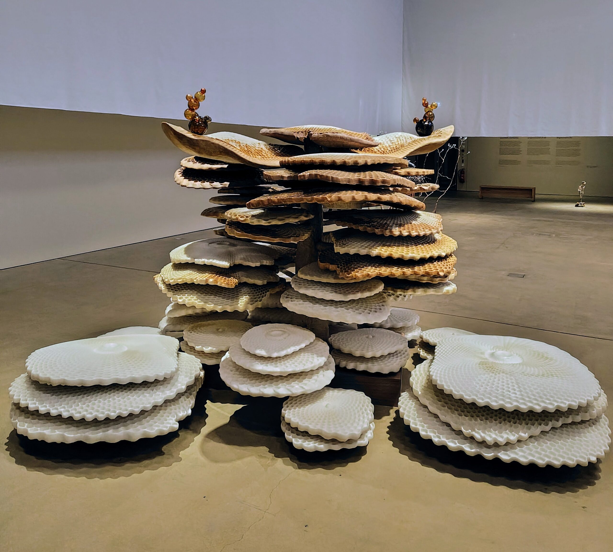 一部を紹介します。アラバスター、テラコッタ、ガラス、蜜蝋、ゴム、ポリウレタンフォーム、金属、木材、シリコン……これでもほんの一部です。とにかく多種多様な素材を駆使しており、技術力の高さにまずは驚きます。彫刻と呼べばよいのか、それともインスタレーションと呼べばよいのか? ジャンル分けが難しい作家でもあります。いえ、ここまでやりたい放題に造形していれば、もはやジャンル分けは不要なほどの域に達していると思います。
