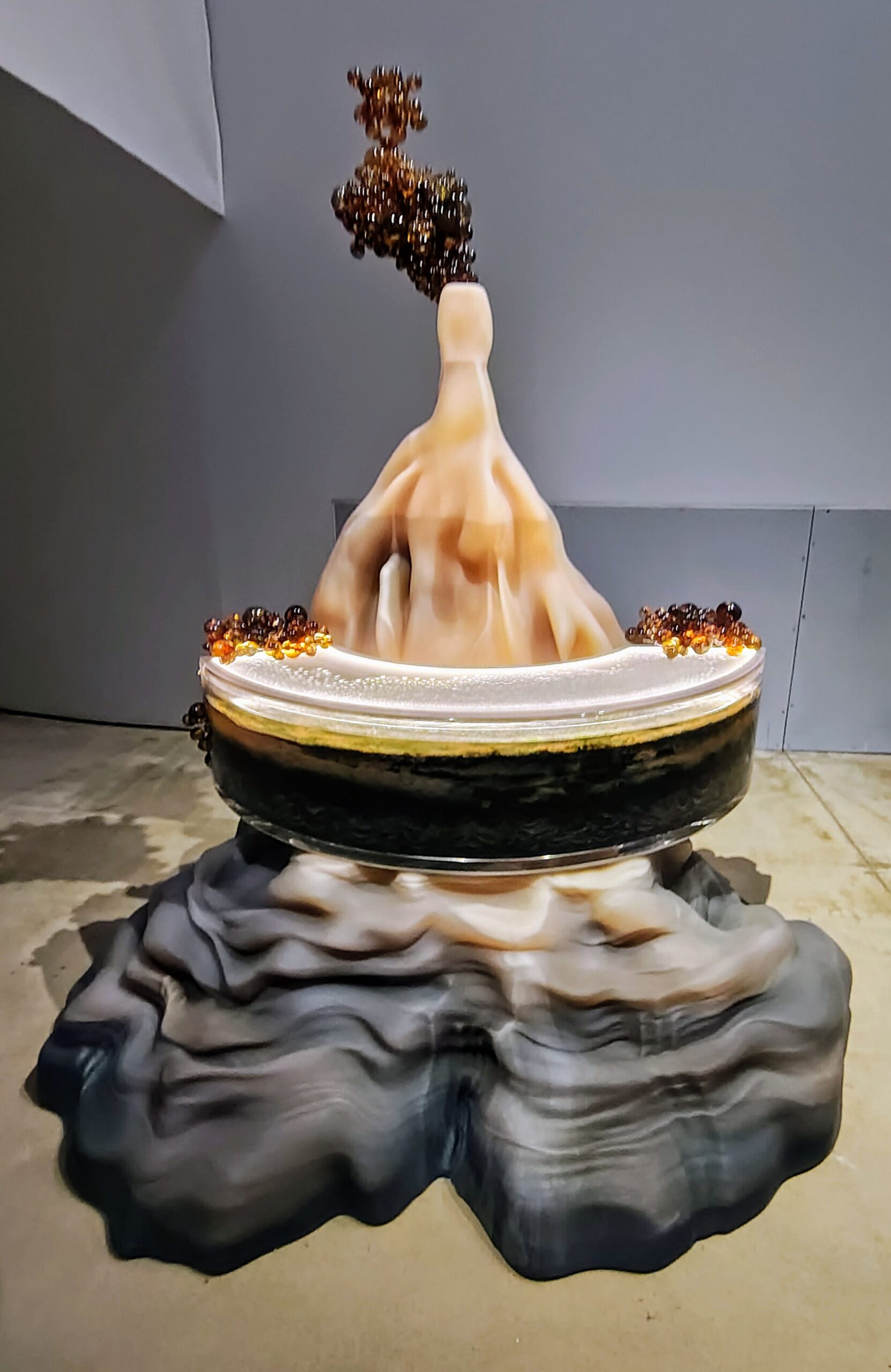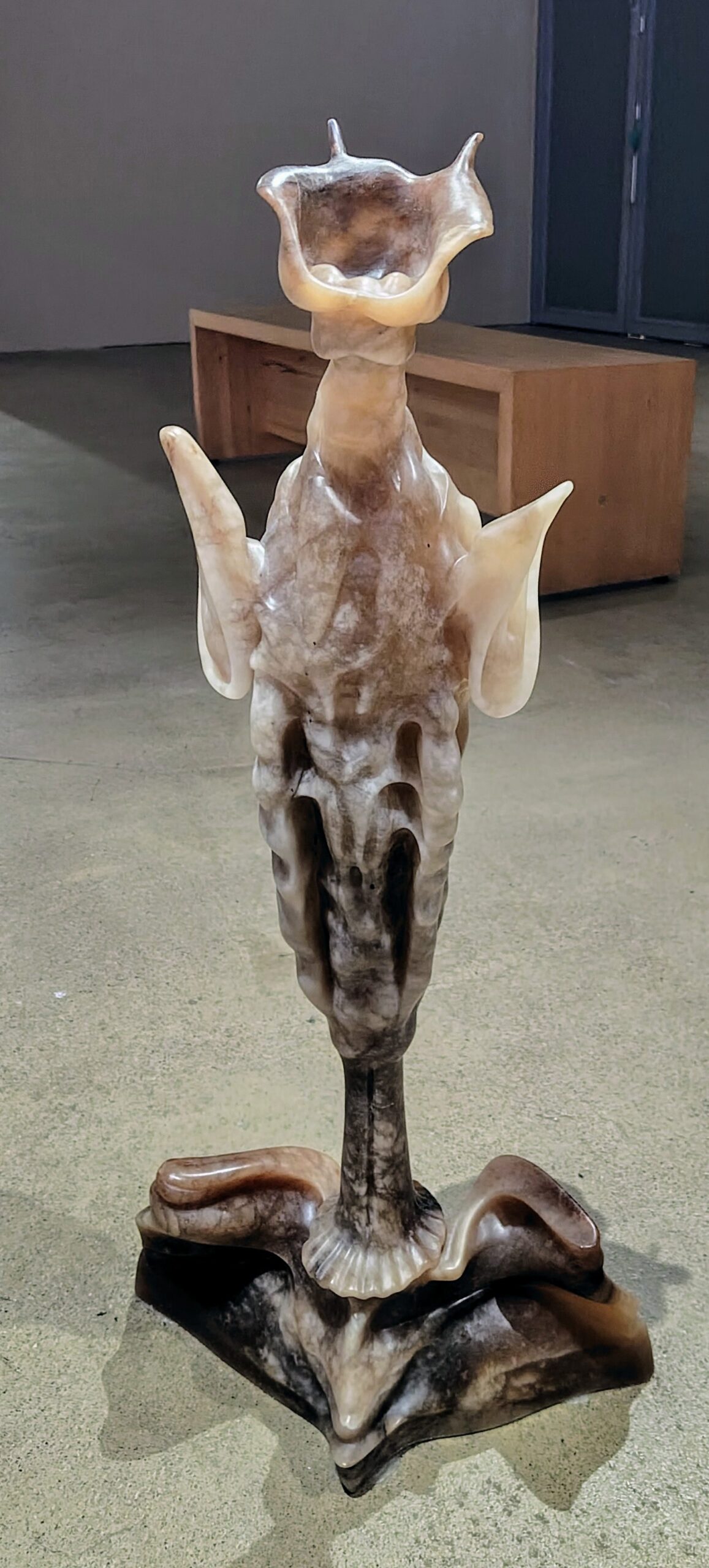 また、どの作品も「水」や「液」を滴らせているように見える点も共通しています。実際に液状の物質が作品上を滴っているものもありましたが、何も滴っていないものも多いです。ただ、どんな作品も有機的な生命体のようで、その表面に「水」的なものが湛えられている感覚があったのです。比喩的に申し上げますと、鍾乳洞の中の不思議な造形物である鍾乳石にも似ています、ユモーの作品は。鍾乳石は、必ずどこか濡れたような感じがします。そう、考えると、気の遠くなるような時間をかけて自然が作り上げる奇妙な形態を、彼女は人間の想像力や手わざを駆使して作り上げようと試みているのかもしれません。
