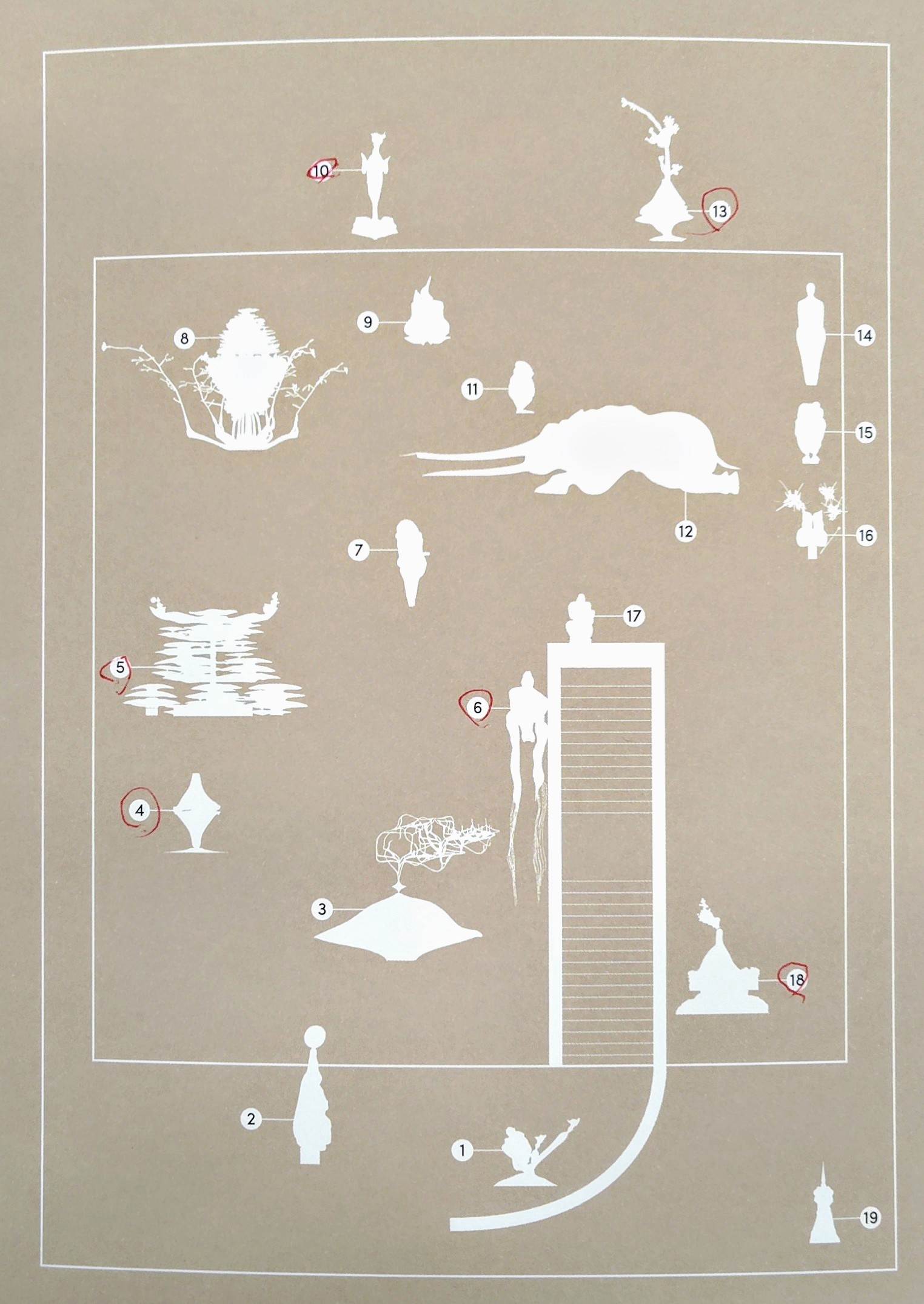 作品の輪郭が白抜きで表示されたパンフレット内のマップ