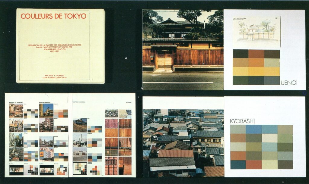 図1 『東京の色彩』 ジャン・フリップ・ランクロ『東京の色彩』(カラープラニングセンター・美術出版社,1972)の表紙と中面.『カラースタイリング別冊/色彩の地理学』(三栄書房,1989)より.写真や街の要素を還元化したカラーチャート,デッサンなどで構成されている.