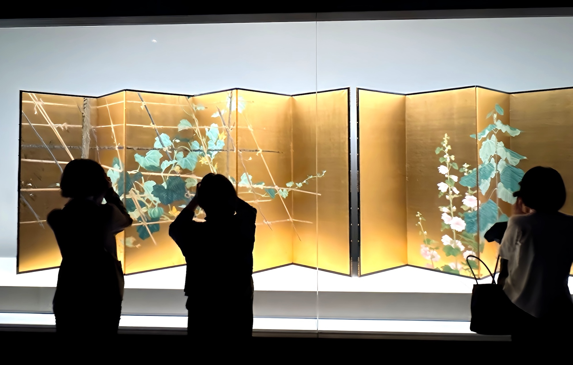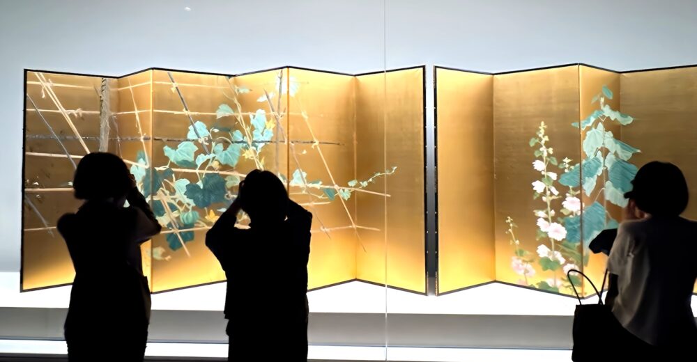 下村観山《唐茄子畑》(1910年頃、六曲一双、東京国立近代美術館蔵)を単眼鏡で鑑賞するプレス関係者たち