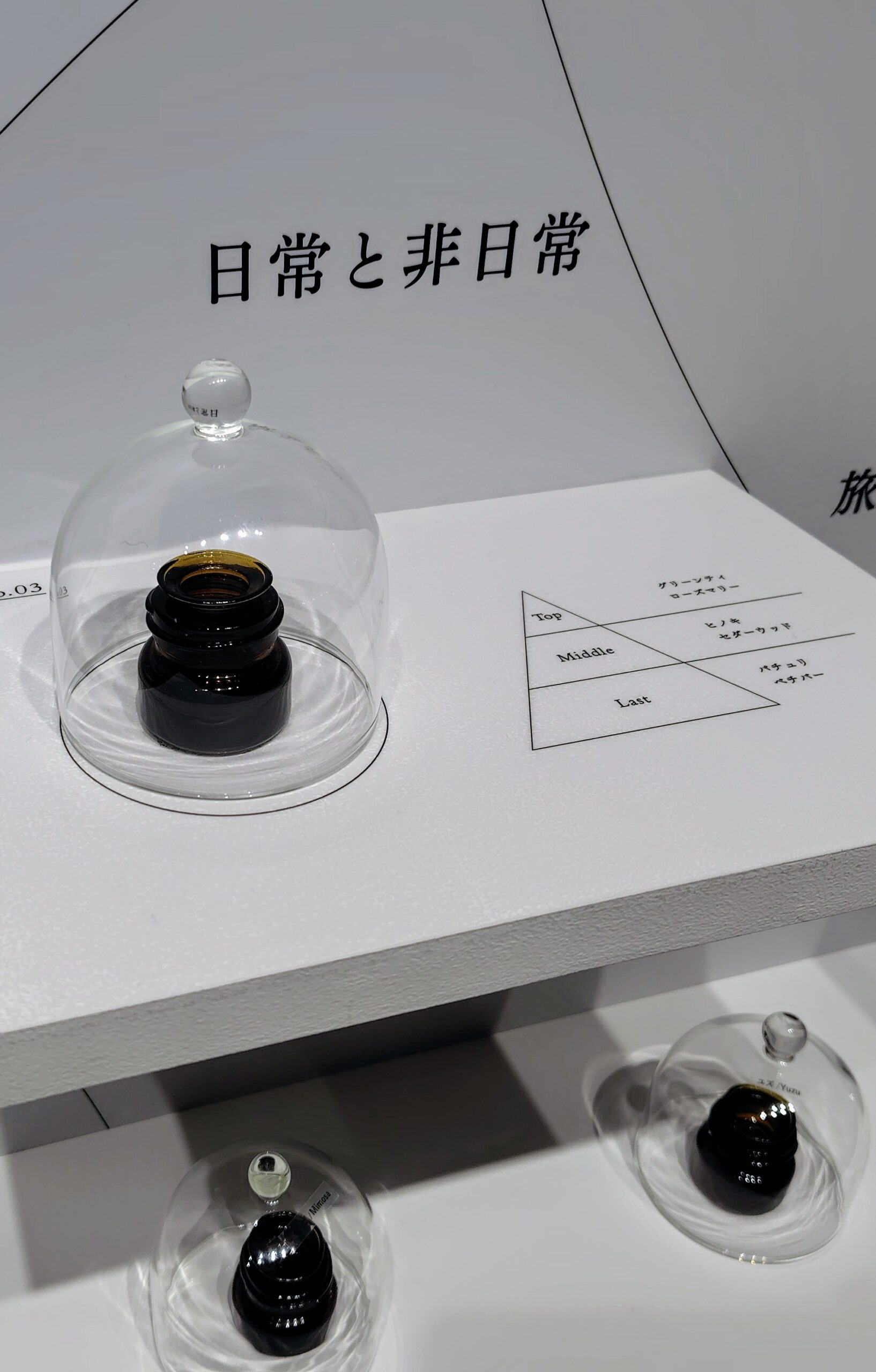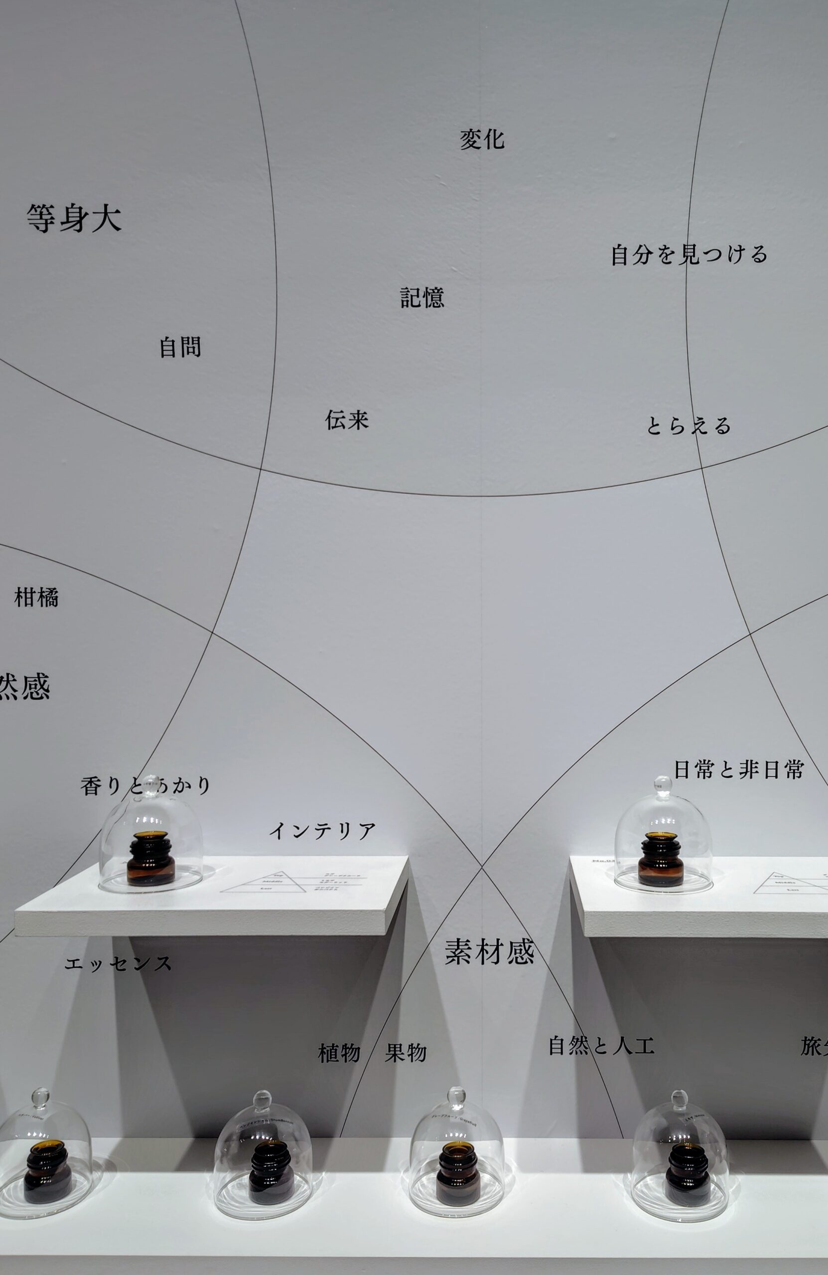「日常と非日常」「香りとあかり」「自然と人工」「自分を見つける」「なつかしさ、でも新しい」「半径1m以内」「ジェンダーレス」といった、ちょっと気になる言葉が、壁に設置されたパネルの上に点在しています。様々な想像を促す、これらの言葉の展示から“抽出された香り”4点が並べられています。この4つの香りを生み出すために用いた素材の香り9点も展示されていました。