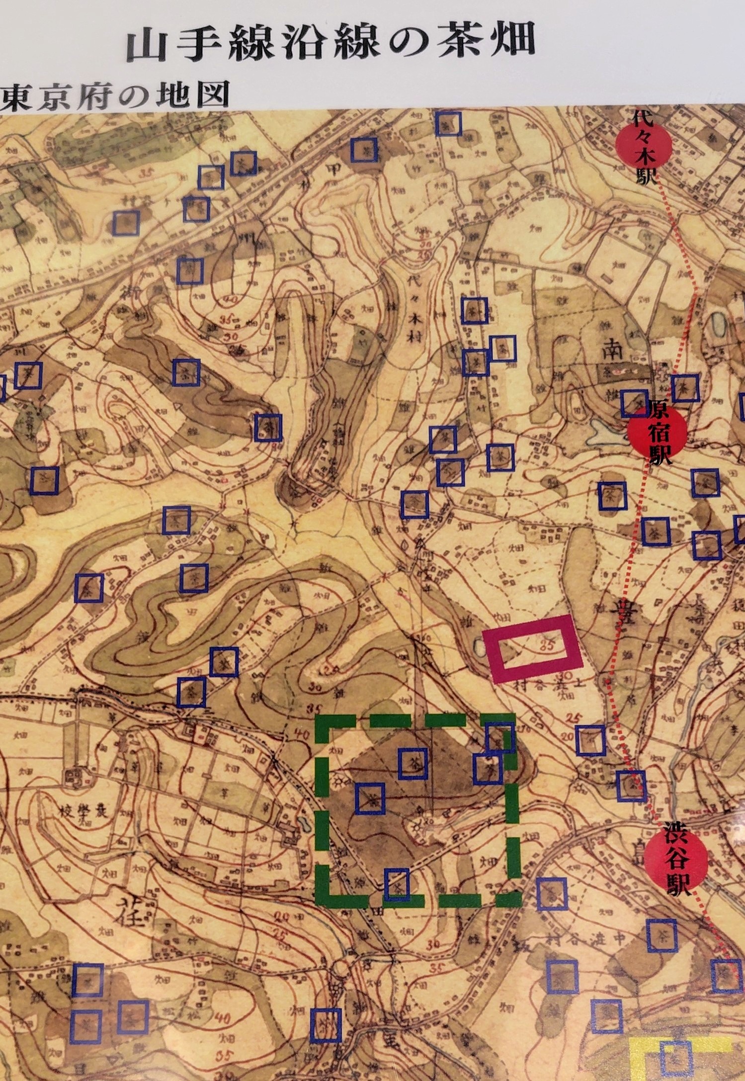 先日、都内某所で1880年代の東京府で茶畑のあったエリアを示した地図に出合い、あまりの多さにびっくりしました。北から南に向かって、代々木→原宿→渋谷→恵比寿→目黒に至るエリアが地図の中に収まっています。代官山や中目黒の周辺も入っています。青い四角で囲ってあるのが茶畑です