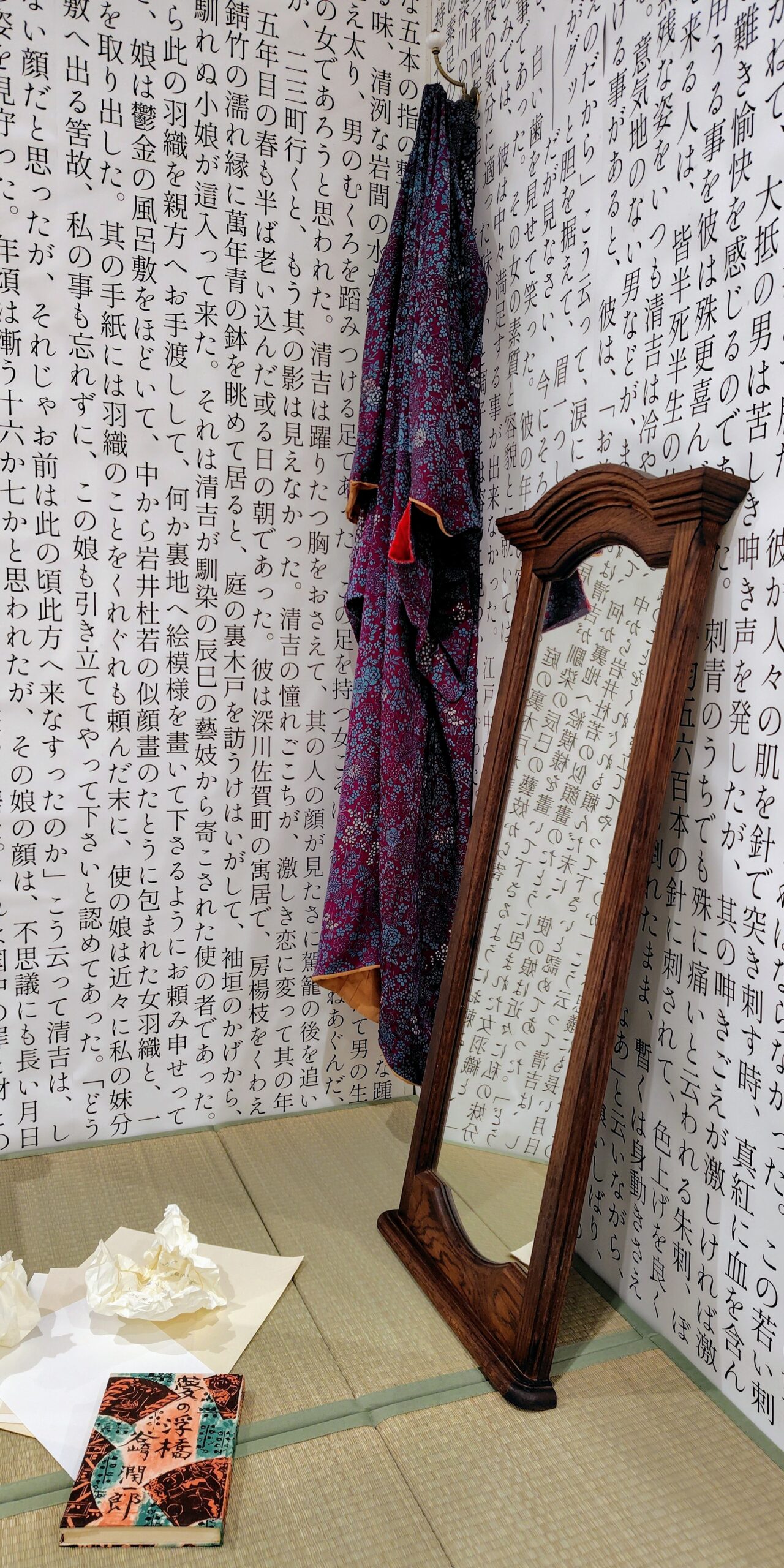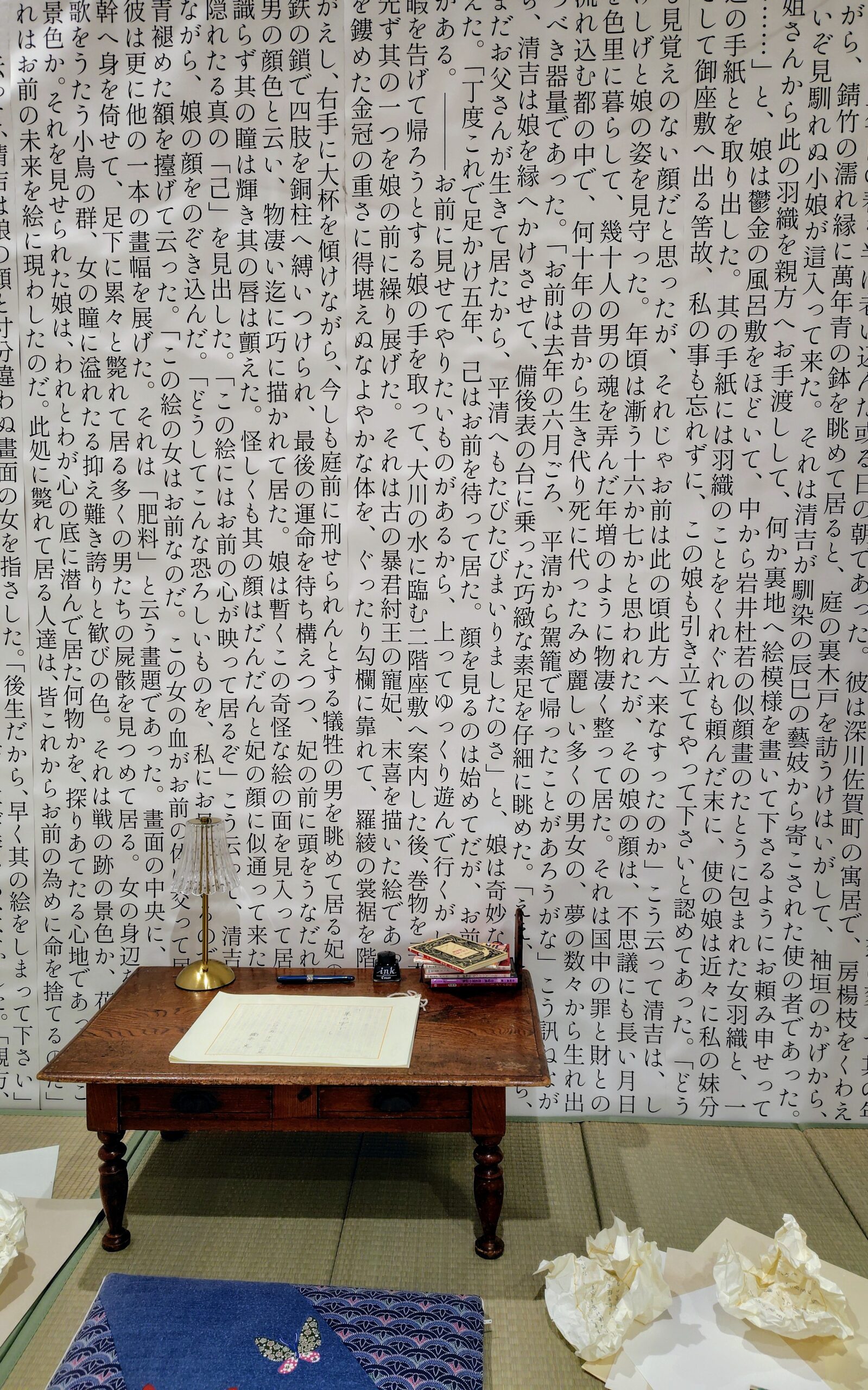 いけない、展示に戻りましょうか。この書き出しが巨大な文字で印刷された壁面状のものが衝立のように会場内に置かれています。この壁面が包むのは、畳敷きの空間、座布団、文机などです。文机の周りには、書き損じた原稿用紙がぐちゃぐちゃに丸められています。典型的な文豪の書斎風景です。