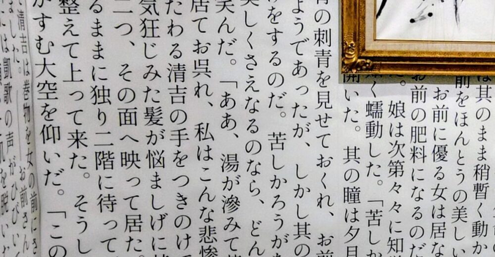 鏡に映り込んだ反転した文字を読むのも一興だ文章が映像的なんですよね。読んでいると、自然に頭の中にビビッドな映像が浮かんでくるんです。映画監督・増村保造(1924~1986年)の大映京都作品「刺青」(1966年)も非常に素晴らしい映画なのですが、谷崎の文章を読みながら頭に浮かぶ“映画”の方が、筆者にとってはよほど名画なのです。