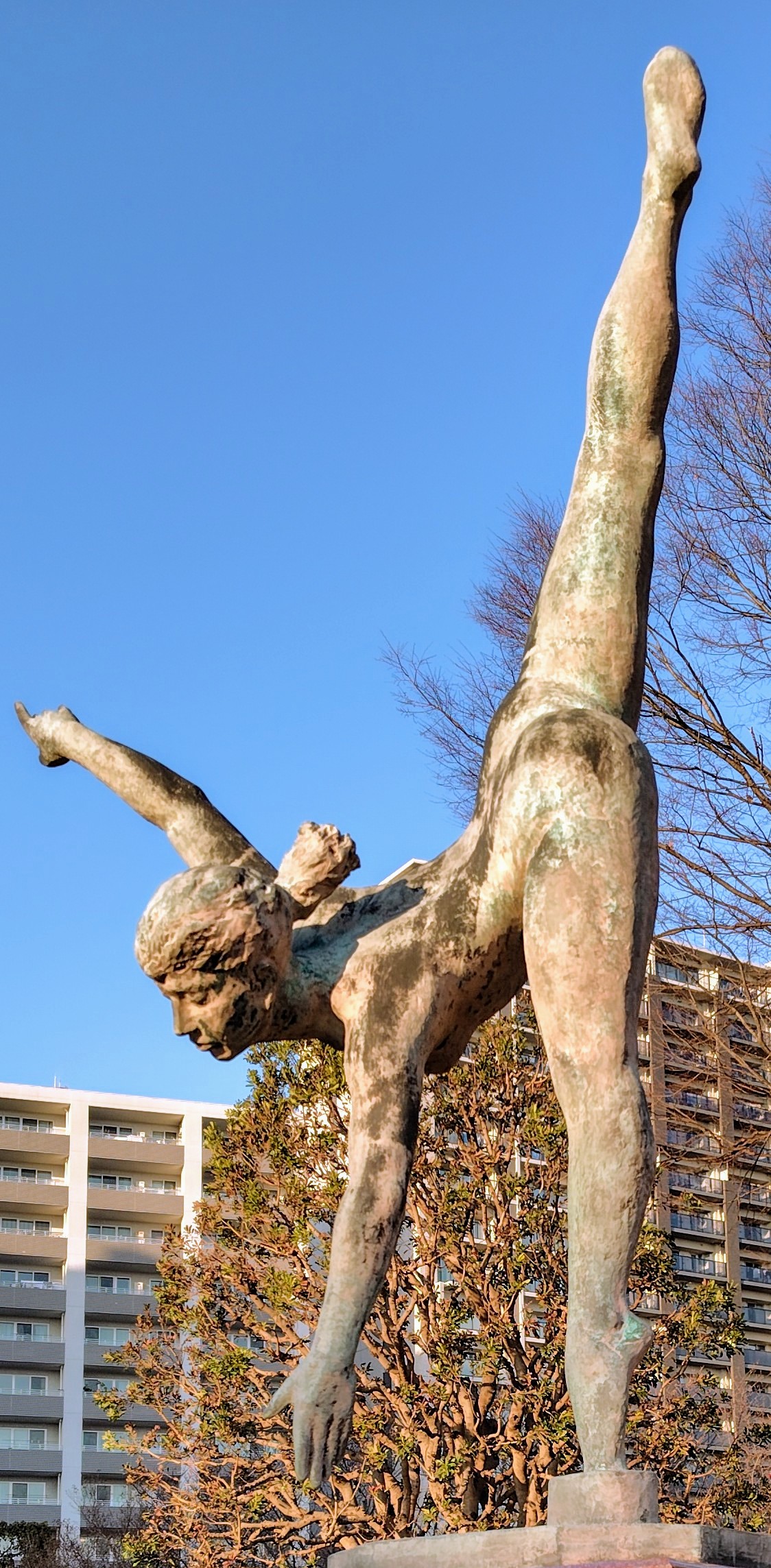 高田博厚(1900~1987年)の作品「空」(ブロンズ)は1979年の竣工。鎌倉・稲村ケ崎のアトリエで制作されました。藤沢市には、本作以外にも「地」「海」というブロンズの高田作品が存在します。仏教の重要な概念である「四大(しだい)」は「地・水・火・風」を指しています。もしかしたら、高田は、「火」をモチーフにした作品も構想していたのではと勝手に想像して楽しむ筆者でした。