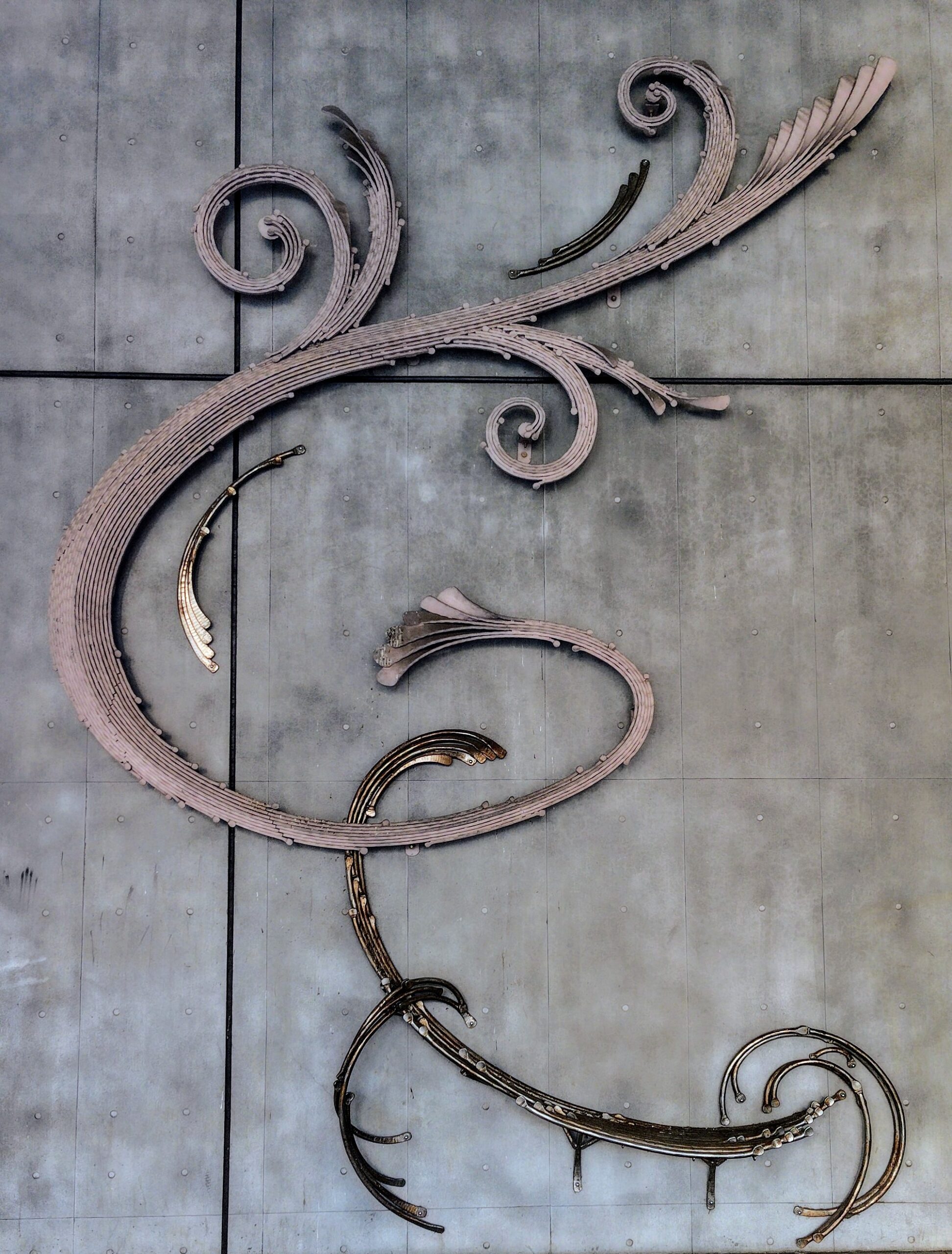 旧近藤邸をさらに奥に進むと、突き当りに秩父宮記念体育館にぶつかります。その外壁には、小峰貴芳(1950年生まれ)の「円舞」(鍛鉄)が設置されています。高さ5メートル以上、横幅4メートル近くの巨大な作品です。壁を縦横に走る優雅なうねりは植物の蔓を想起させます。