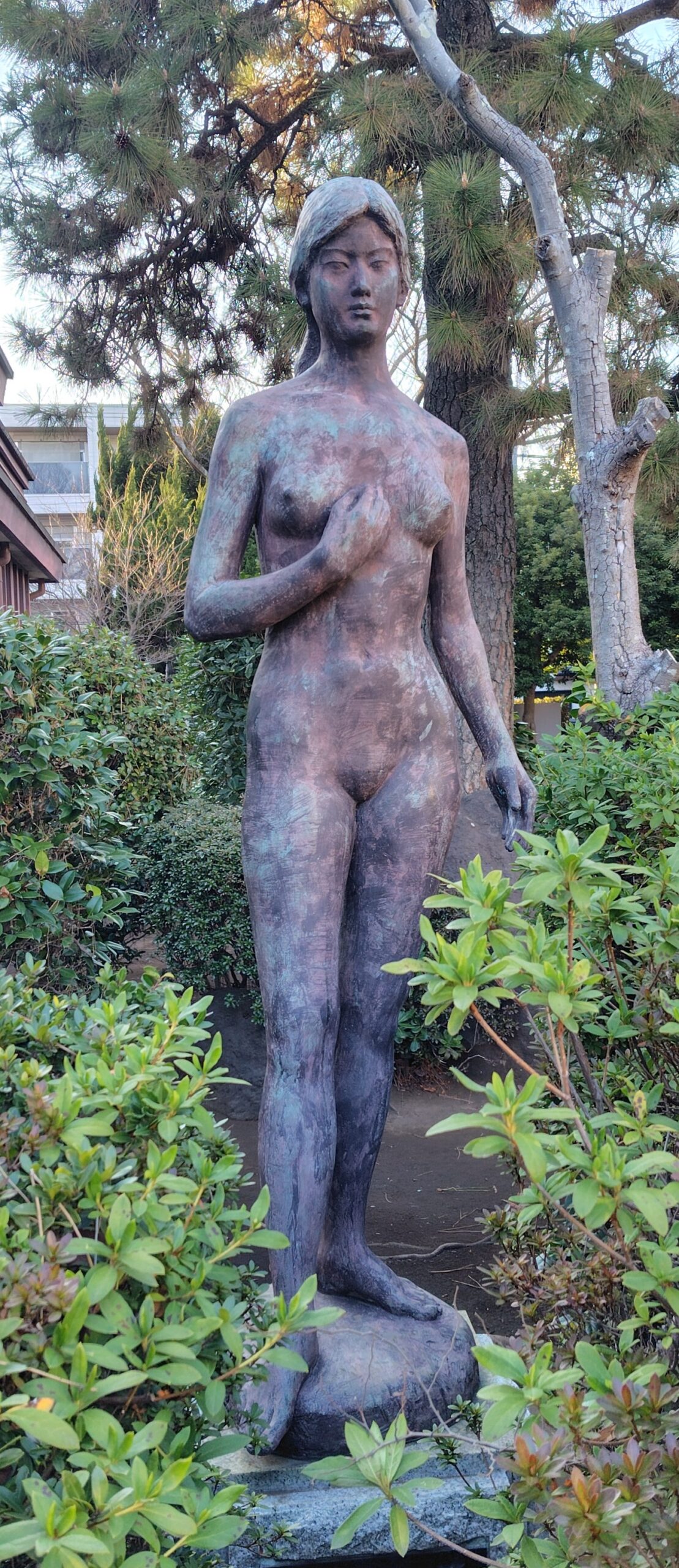 この素敵な建築の前に日展評議員も務めた陶山定人(1926~2009年)の「まごころ」(ブロンズ)が佇んでいました。理想化された、非常にスラリとした形象です。横顔も洗練された表情をしており、陶山の高い精神性がうかがえます。