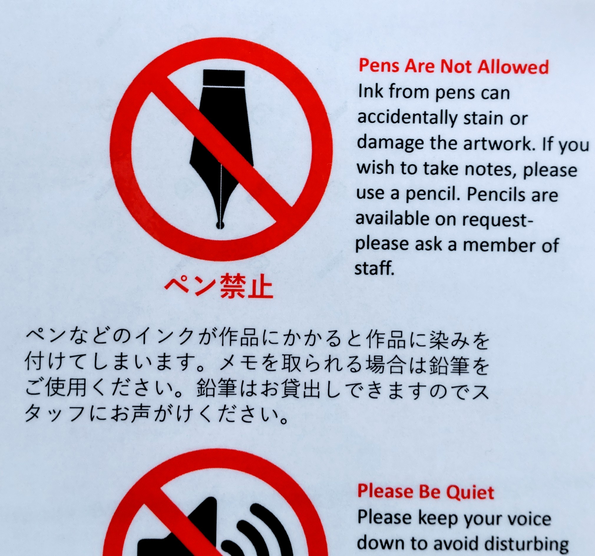 ペンのインクが飛び散る恐れなんてありません。また、ペンを持った来館者が、ペンを“凶器”にして作品に襲い掛かることもありません。鉛筆を持っていたって、何も持っていない素手でも作品は簡単に棄損できる以上、非科学的なオカルトのような「ペン悪者説」にのっとって来館者に注意をするのは金輪際、やめてください。