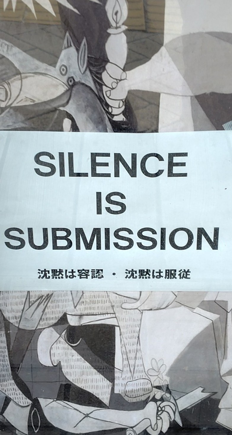 ピカソ「ゲルニカ」をバックに、素晴らしい言葉が書かれています