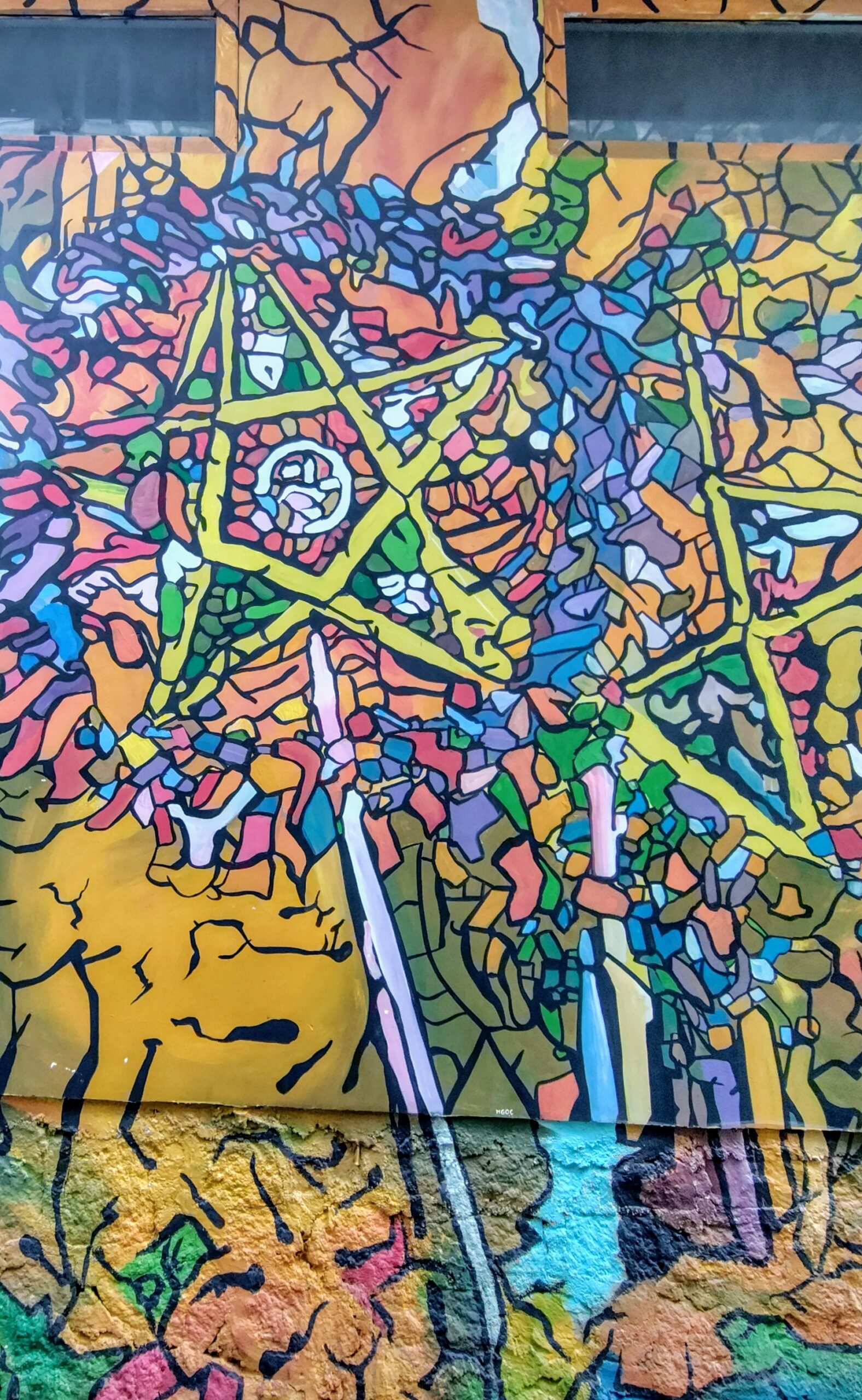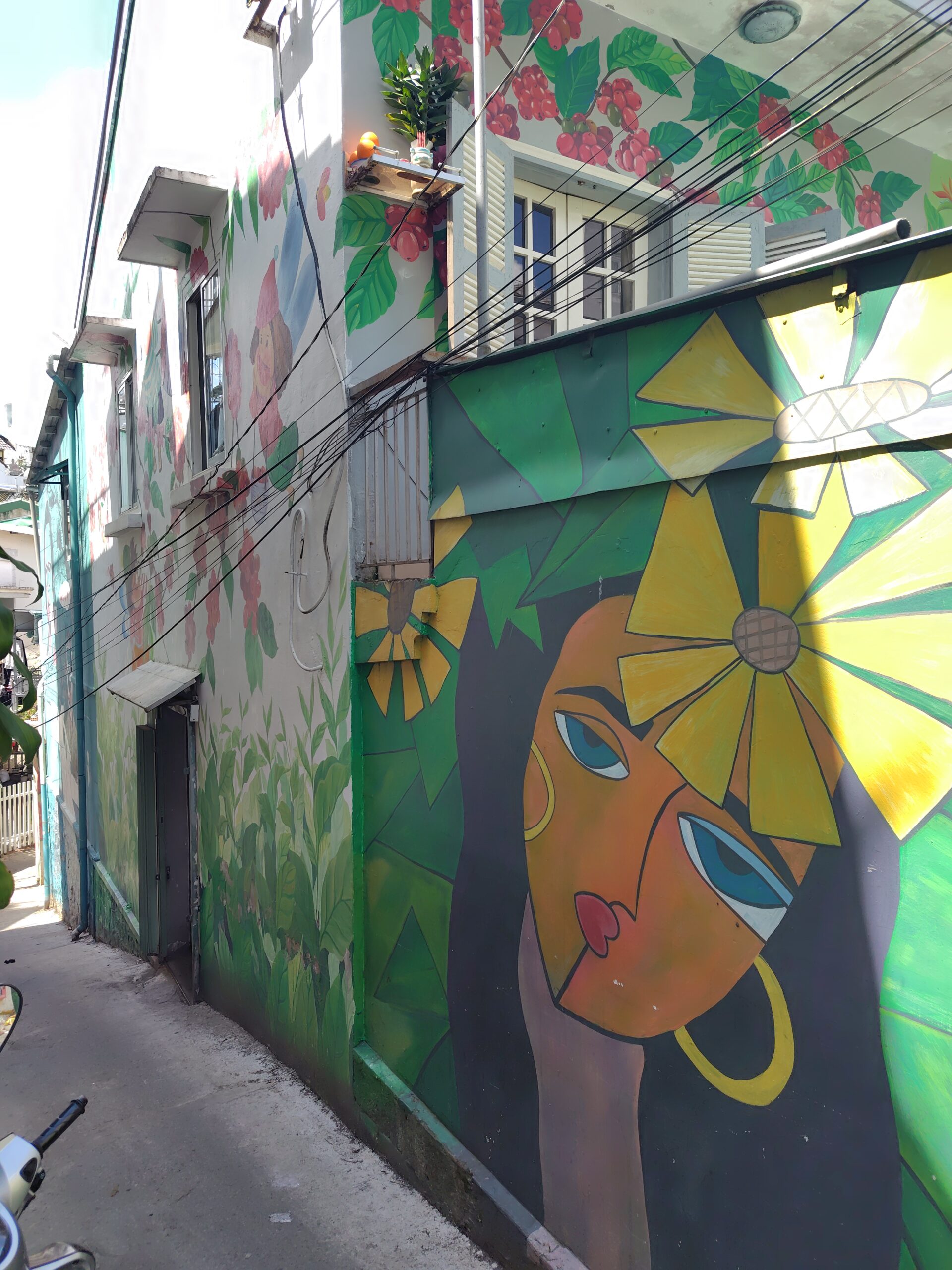 大きな黄色の花を頭部にあしらった女性のポートレートが建物の側壁に描かれております。その奥には、色とりどりの花々が外壁を覆っています。まぁ、確かにきれいと言えばきれいですが、しょせんは観光スポットの記念撮影の背景に過ぎない、大して面白味のない作品と言えるでしょう。