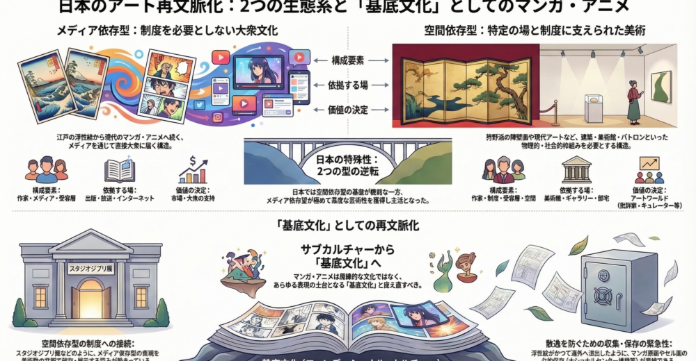 ここで改めて問い直す必要があるのは、メディア依存型の表現をサブカルチャーと呼ぶことの妥当性である。浮世絵から漫画・アニメへと連なるメディア依存型の表現は、特定の空間や制度に依存することなく、広く人々の日常に浸透し、その精神の基底を形成してきた。それはサブカルチャーどころか、あらゆる精神の基底にあるファンデーショナル・カルチャーと呼ぶべきものではないか。メインカルチャーとサブカルチャーという従来の序列は、空間依存型の制度を自明の基準として成立していた。しかしその基準自体を問い直すとき、メディア依存型の表現こそが日本の視覚文化の本流であり、空間依存型のアートはその傍らに位置する一形式に過ぎないという逆転の認識が生まれる。