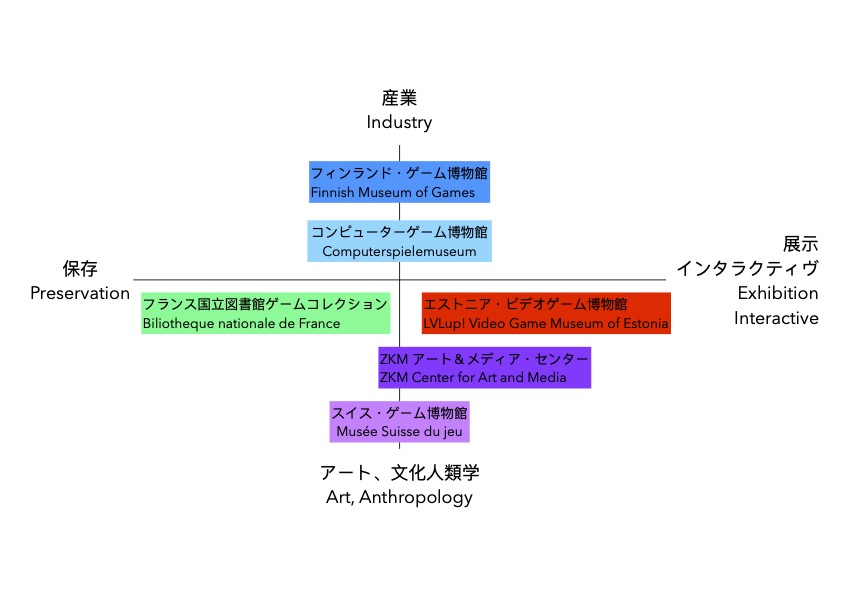 どこの施設もそれぞれのコレクションの形成や組織母体のあり方と照らし合わせながら、さらにゲームをどのように位置付けるかという各館の立場によって、保存とインタラクティヴ性が、両立あるいは揺らいでいるのが分かるだろう。また産業かあるいはアートや文化人類学という分類については、それぞれの施設の中でも複数の視点があるのはいうまでもない。