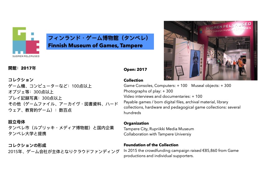 北欧、フィンランドのタンペレという都市にあるフィンランド·ゲーム博物館では、コミュニケーション·メディアとして、そして国の産業·文化としてのゲーム史が紹介されている。