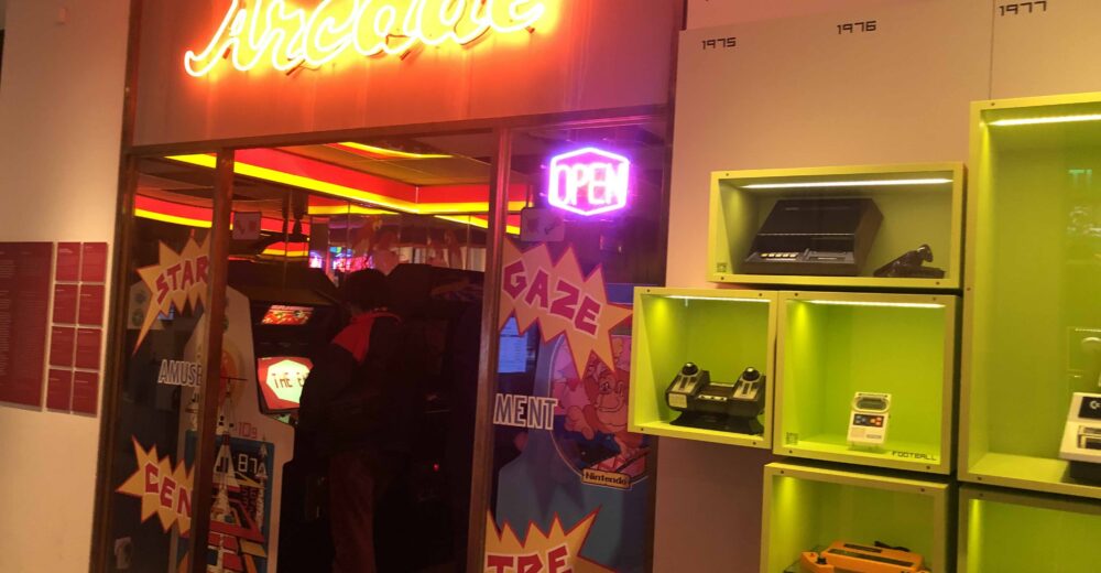 この館のもう一つの特徴が、ゲームを当時のプレイしていた環境とともに経験できることだ。アーケードゲーム機の部屋では、昔のゲームセンターを思い起こさせるような、暗い照明、ネオンライトに若者がたむろする雰囲気のコーナーとなっており、タバコ、アルコールはないものの、かつての不良の溜まり場感が再現されている。