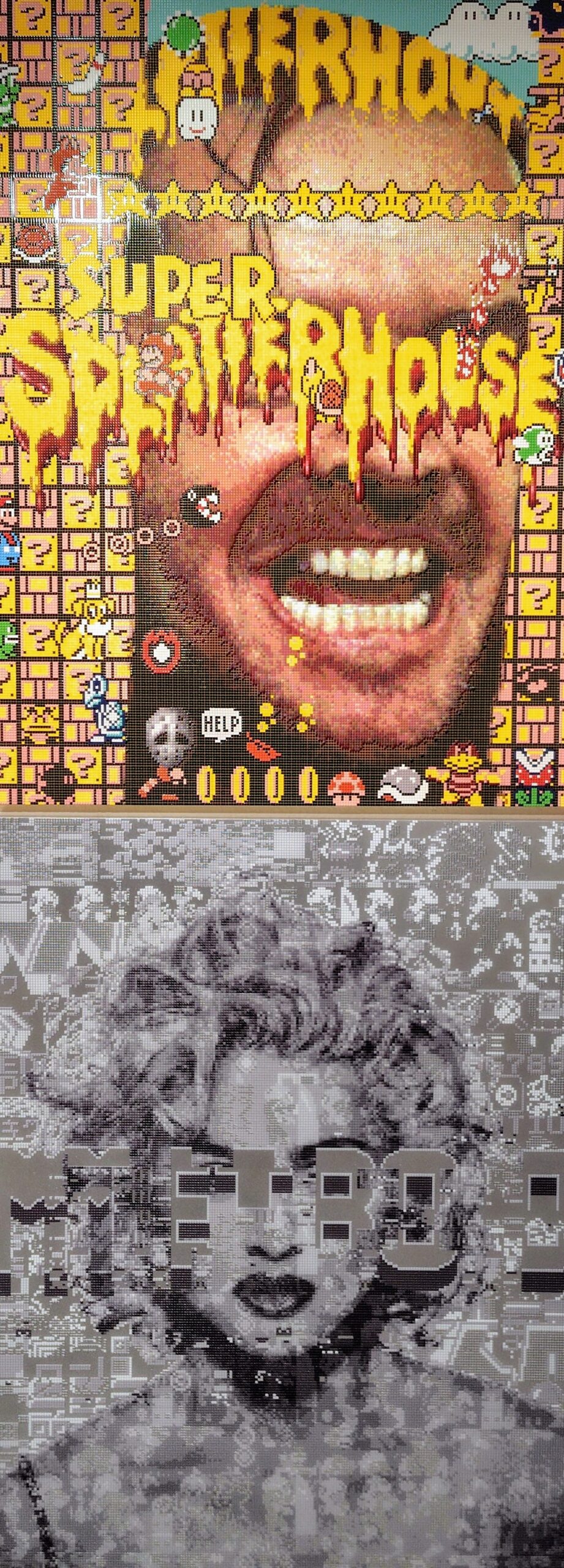 ただ、江戸の大首絵は背景を省略し、画題に選ばれた人気者を目立たせていたのに対して、森作品はまったく様相が異なります。背景を省略するどころか、その真逆。ゲームに登場するキャラクター画像などが背景をびっしりと埋め尽くしているのです。また、マドンナらの顔面上も文字類が横切っており、せっかくの人気者の顔面をある意味、毀損しているのです。いったん令和版大首絵を描いた後、そのポップな姿をゲームのイメージで大きく浸食させています。実に手の込んだ大首絵です。「大首絵の“大首性”を否定したような大首絵」です。