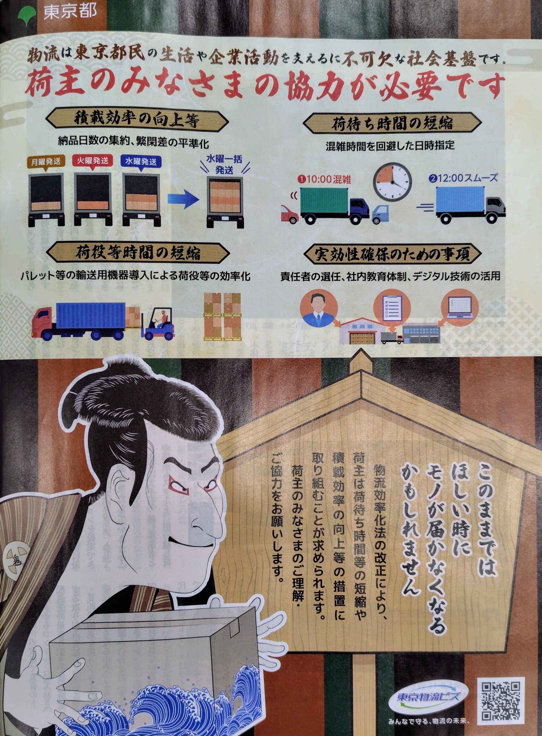物流効率化法改正に伴い、荷主は荷待ち時間等の短縮や積載効率の向上等の措置に取り組むことが求められるのだとか。この広告の左下に登場したのが、東洲斎写楽の「三代目大谷鬼次の江戸兵衛」でした。大人気ですね、江戸兵衛。