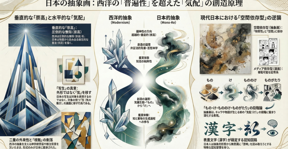 ヨーロッパにおける抽象は内在的必然性を持ち、アメリカにおける抽象は宗教文化的背景としての偶像問題、亡命芸術家と反ファシズムの文脈、アメリカ文化制度と冷戦期の文化外交という三層の合流によって正当化された。日本にはこれらの根拠のいずれも伝わらなかった。しかし日本の文化的基層には、神道的な「像を必要としない感性」という、異なる論理による抽象への傾向がすでに存在していた。問題はこの感性と西洋的抽象の批評言語の接続が成立していないことである。