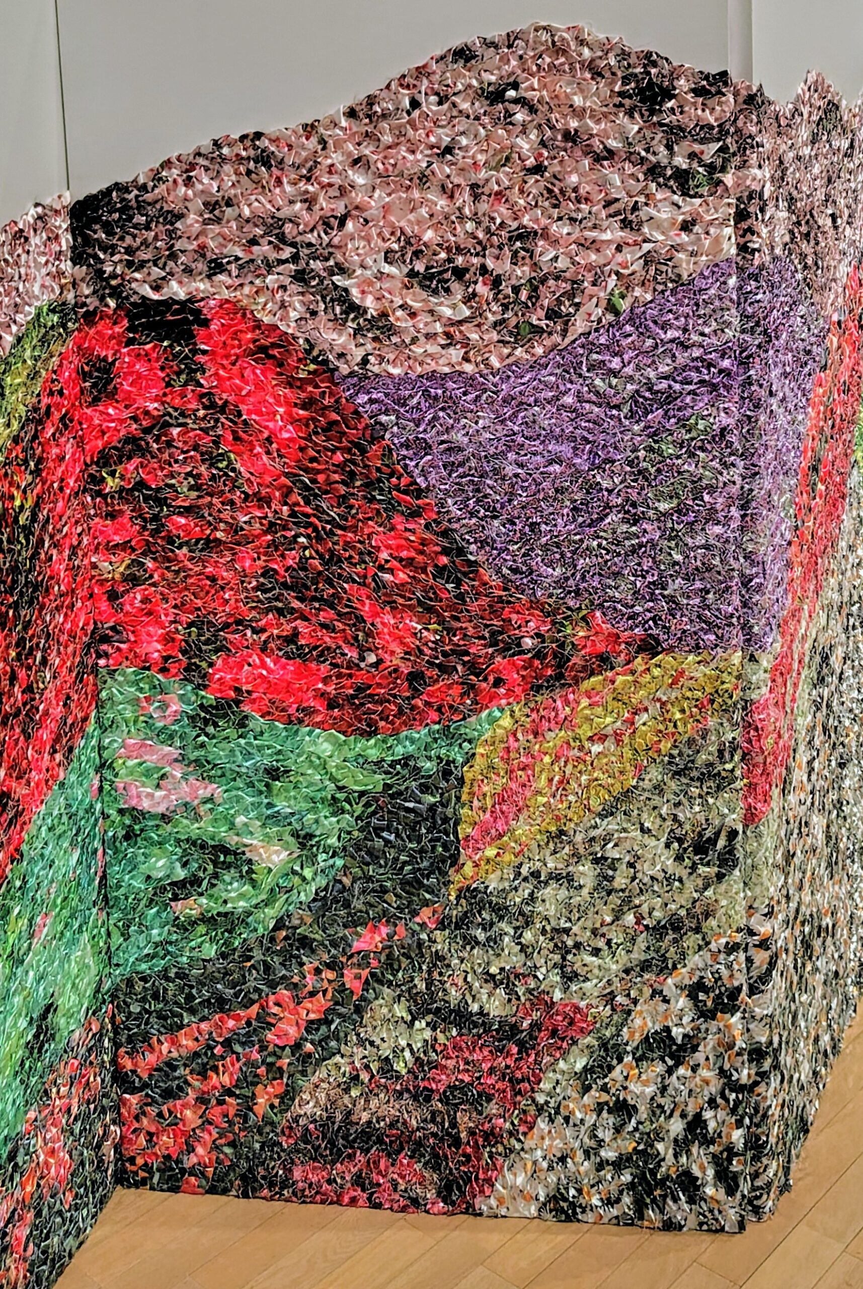 閑話休題。29回展で筆者が気になった作品を紹介していきましょうか。鈴木美緒「春の山の調べ」は、富山県の立山連峰の形で色とりどりにサテンを編み込み、屏風の形として立ち上げた作品。すっきりきれいに仕上げているため、あまり「TARO臭」が漂っていない点に好感を持ちました。サテンの質感は、ベラボーでもなんでもない。肩に力が入りすぎていない普通っぽい感じが好ましかったです。