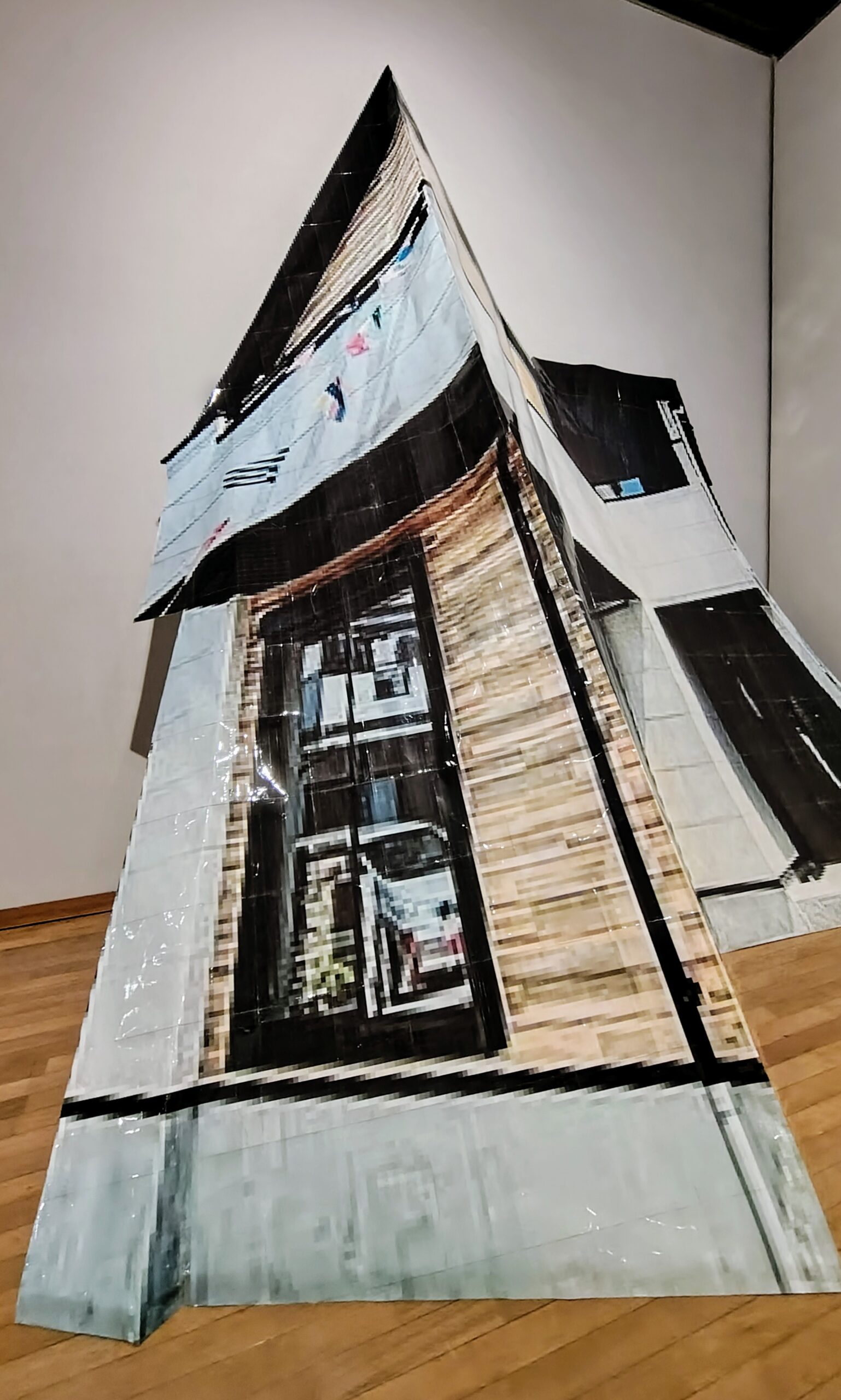 鈴木藤成「僕と鬼の云々」の場合は、神社の写真にブルーシートの切り抜き文字を重ね合わせた絵画と山形の限界集落に打ち捨てられていたブルーシートから形作った鳥居で構成されていました。こちらも德本作品同様、おどろおどろしい雰囲気です。