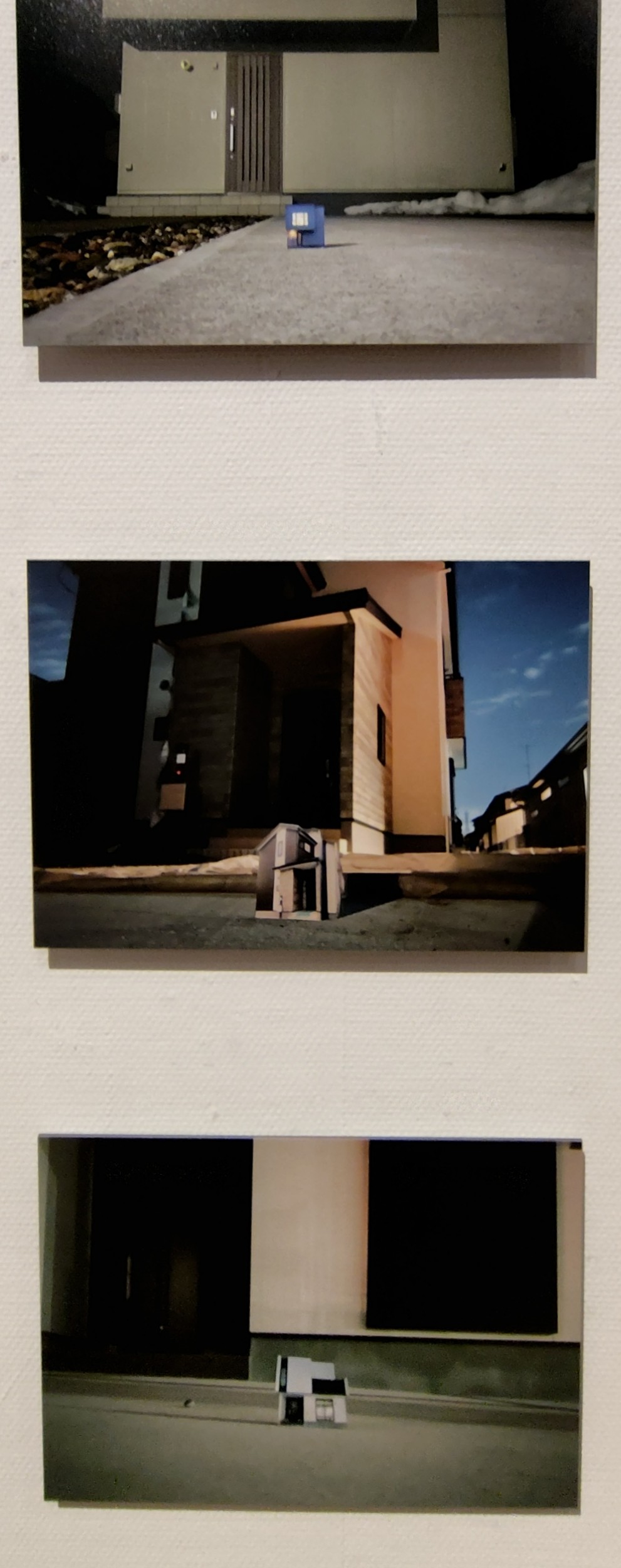 太田遼「建築のような物体X」は、不動産サイトに掲載された写真を元に模型を作り、深夜に実際の建物の前にちょこんとその模型を置き、写真撮影するという作品。リアルな建築物の前に置かれたフェイクの模型という対比が面白い。